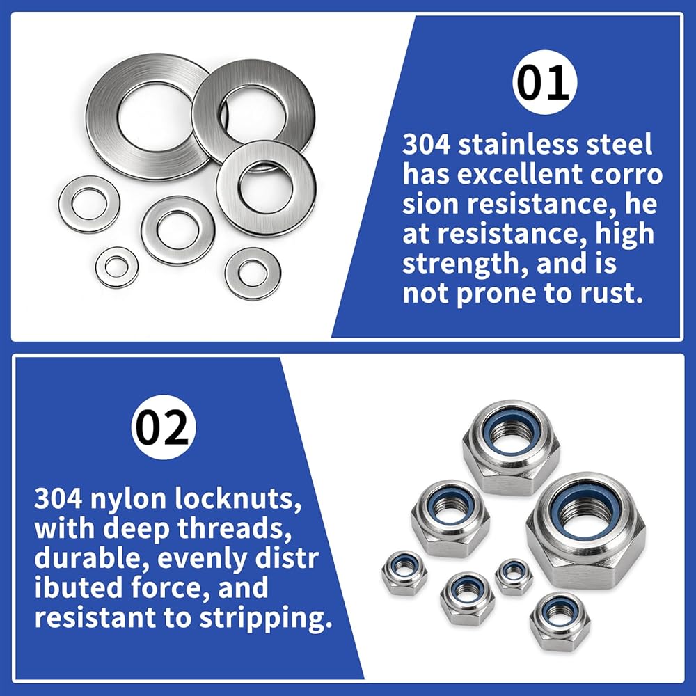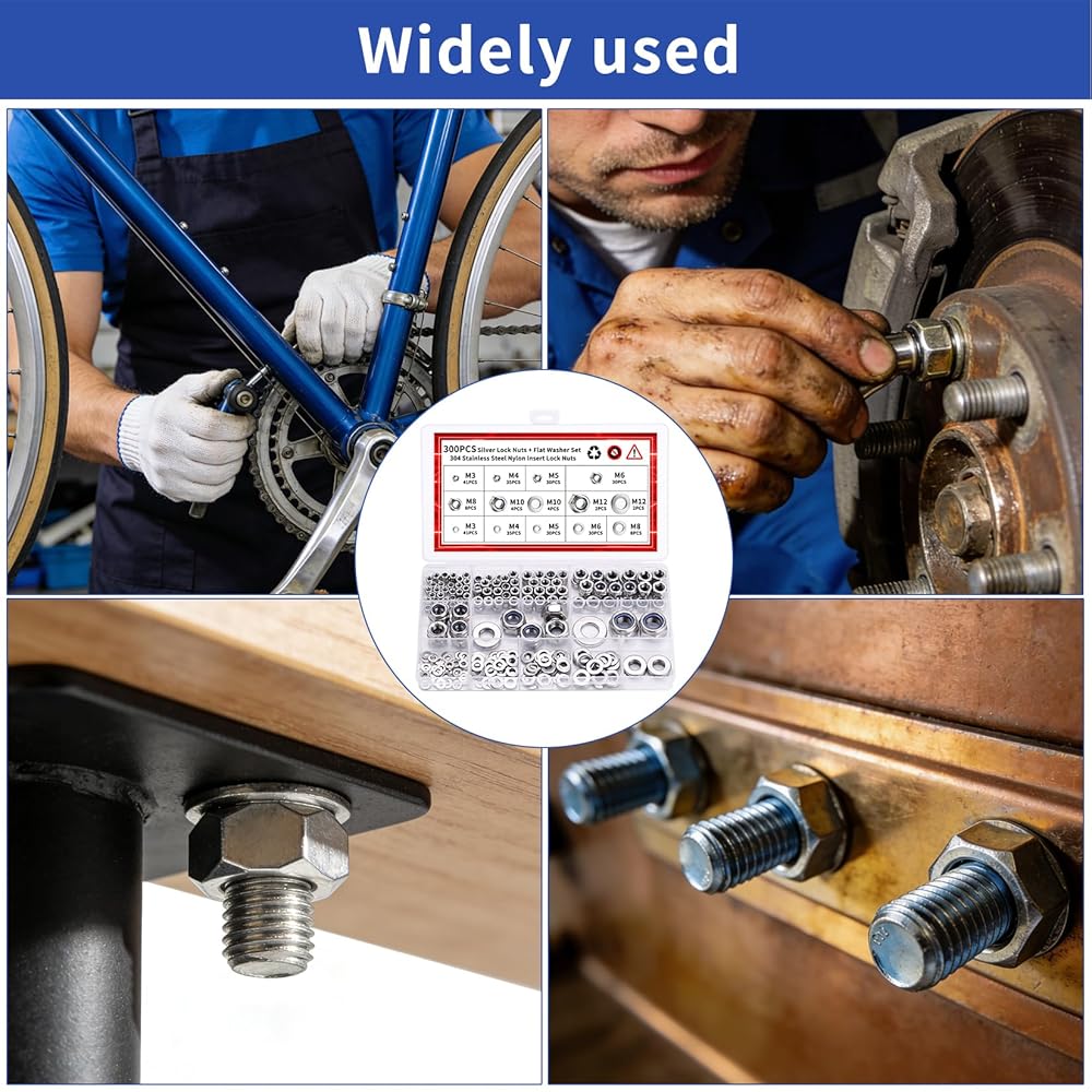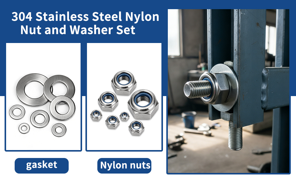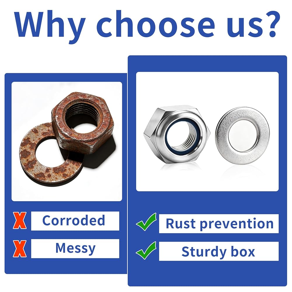 مجموعة صواميل سداسية: قفل صواميل ربط وتأمين الأجزاء. إنها تمنع تعرض الترباس وحركة الترباس العرضية أو الارتخاء. تضمن حشوات النايلون تثبيتًا آمنًا وأمانًا وثباتًا أفضل.