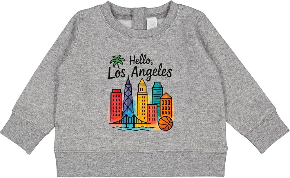 Celebrate the vibrant spirit of Los Angeles with the "Hello, Los Angeles" skyline featuring iconic buildings and a basketball motif. This colorful design captures the energy and excitement of the city, perfect for anyone who loves LA. Available on Baby Sweatshirt for all your urban adventures.