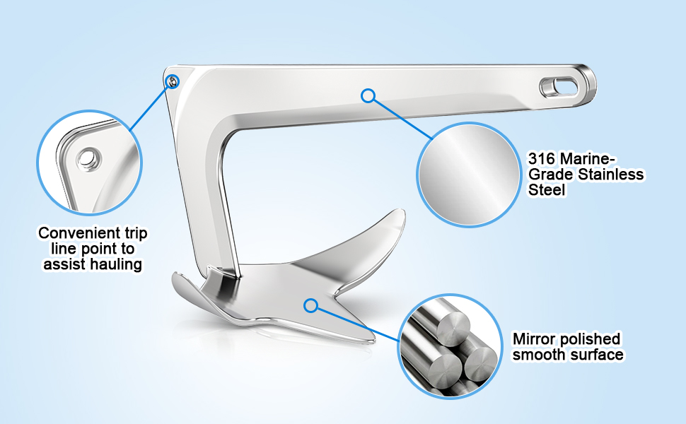 مقاوم للتآكل 316 من الفولاذ المقاوم للصدأ من الدرجة البحرية: مصمم لأقسى البيئات البحرية، الفولاذ المقاوم للصدأ 316 المصقول عالي الجودة يقاوم تآكل المياه المالحة والصدأ والتنقر. لا توفر هذه المرساة المتانة فحسب، بل تحافظ على لمعان المرآة، مما يعزز الأداء والجمال على القارب الخاص بك