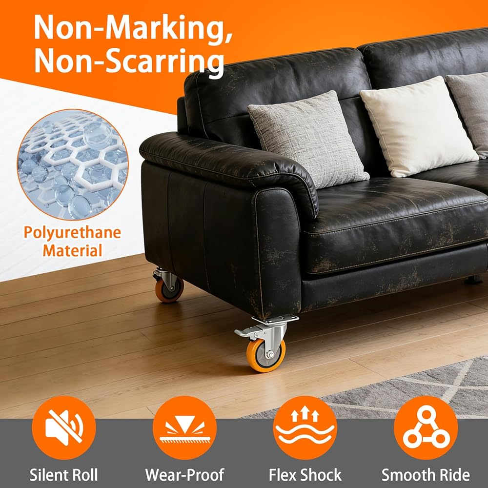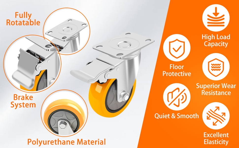 سهولة الحركة: مصنوعة من البولي يوريثين الفاخر، توفر هذه العجلات امتصاصًا ممتازًا للصدمات، وتتدحرج بهدوء، وتنزلق بسهولة على الأرضيات الصلبة دون ترك علامات.