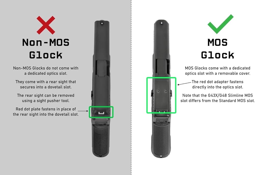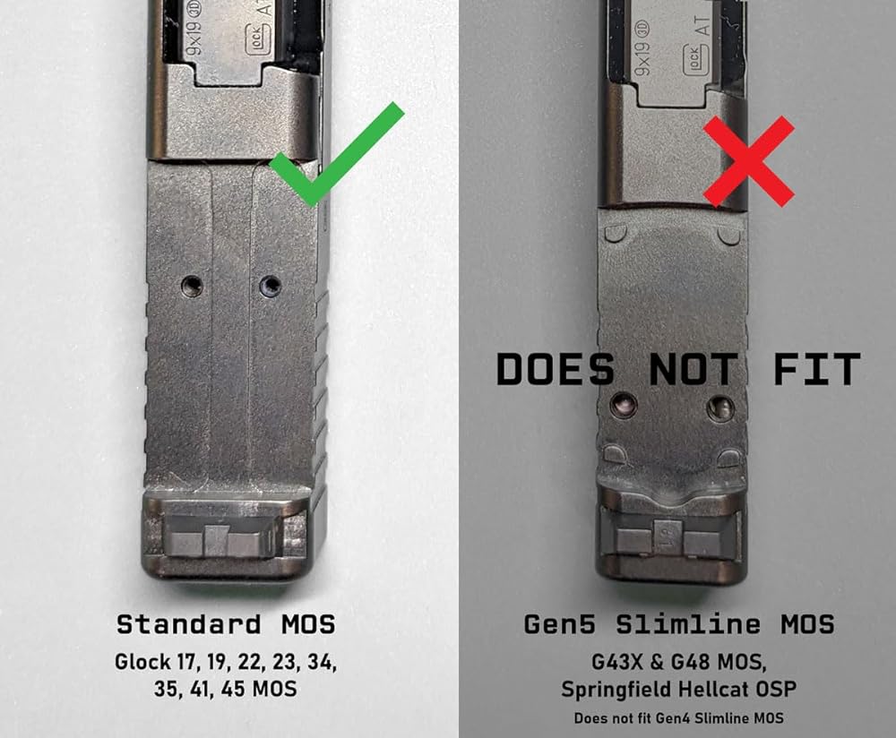 • Compatible with optics ready MOS Version G17, G19, G22, G23, G34, G40, G41, G45, and G47; NOT compatible with Non-MOS version Glocks or with Slimline MOS version G43x/G48 Glock pistols. Not compatible with other pistols.
