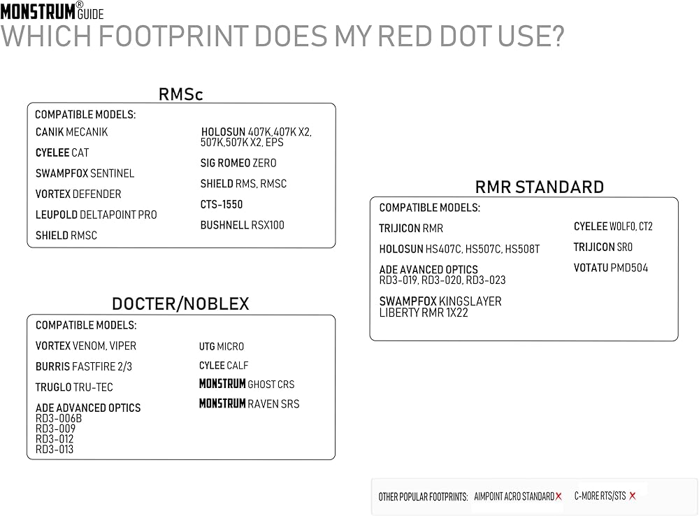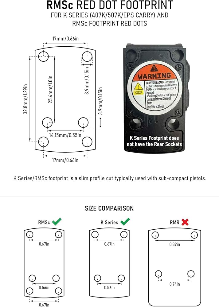 • Compatible with RMSc or Holosun K series (including 407k, 507k, EPS, EPS Carry) footprint red dots only. Please refer to the compatibility chart graphic before purchasing. Includes M3 screws in multiple length for compatibility across different red dot makes and models. Recommended torque specs : 15 in/lbs.