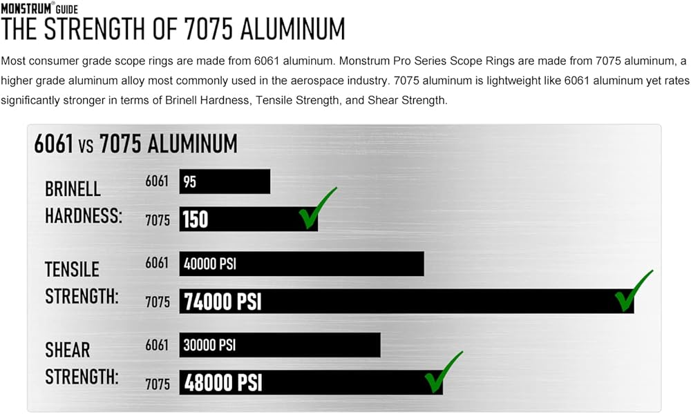 • 7075 Series plates are crafted from 7075 grade aluminum. Most consumer grade gun accessories are made from 6061 aluminum. 7075 aluminum is lightweight like 6061 aluminum yet rates significantly stronger in terms of Brinell Hardness, Tensile Strength, and Shear Strength.