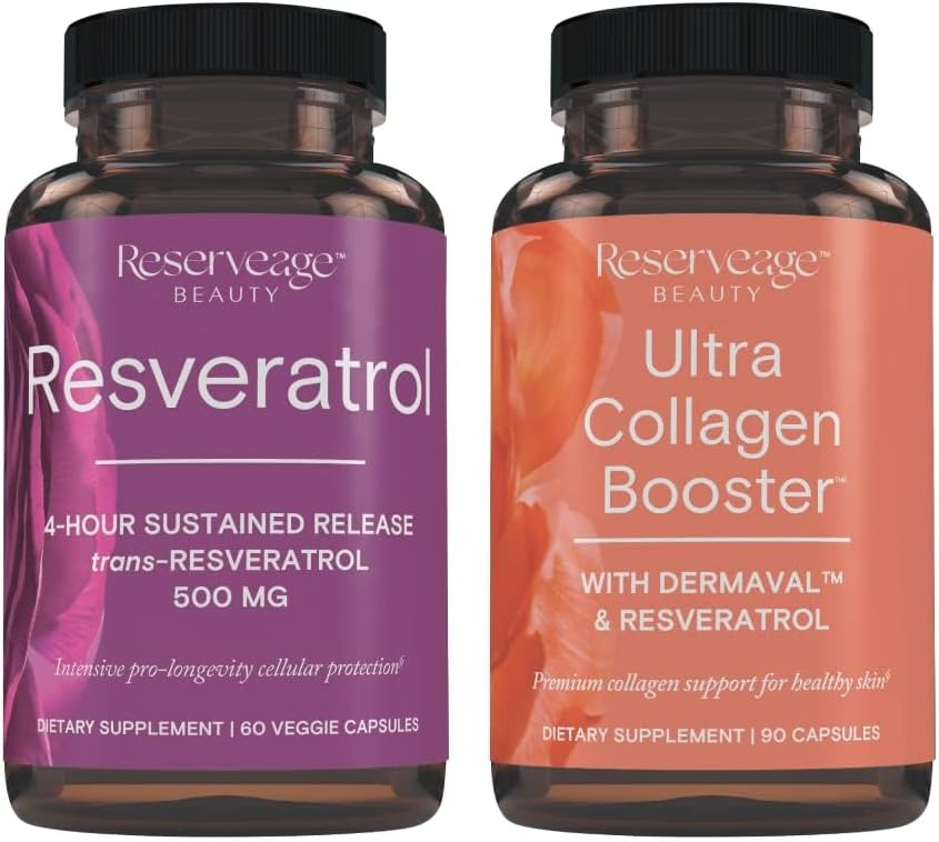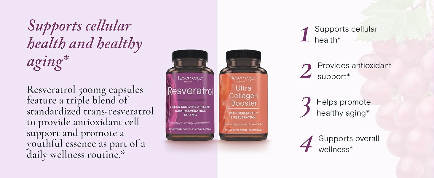 - كبسولات ريسفيراترول وكولاجين عالية الجودة: مكمل ريسفيراترول Reserveage خالي من الغلوتين وفول الصويا والسكر والمواد الحافظة؛ حبوب تعزيز الكولاجين لدينا خالية من منتجات الألبان والغلوتين