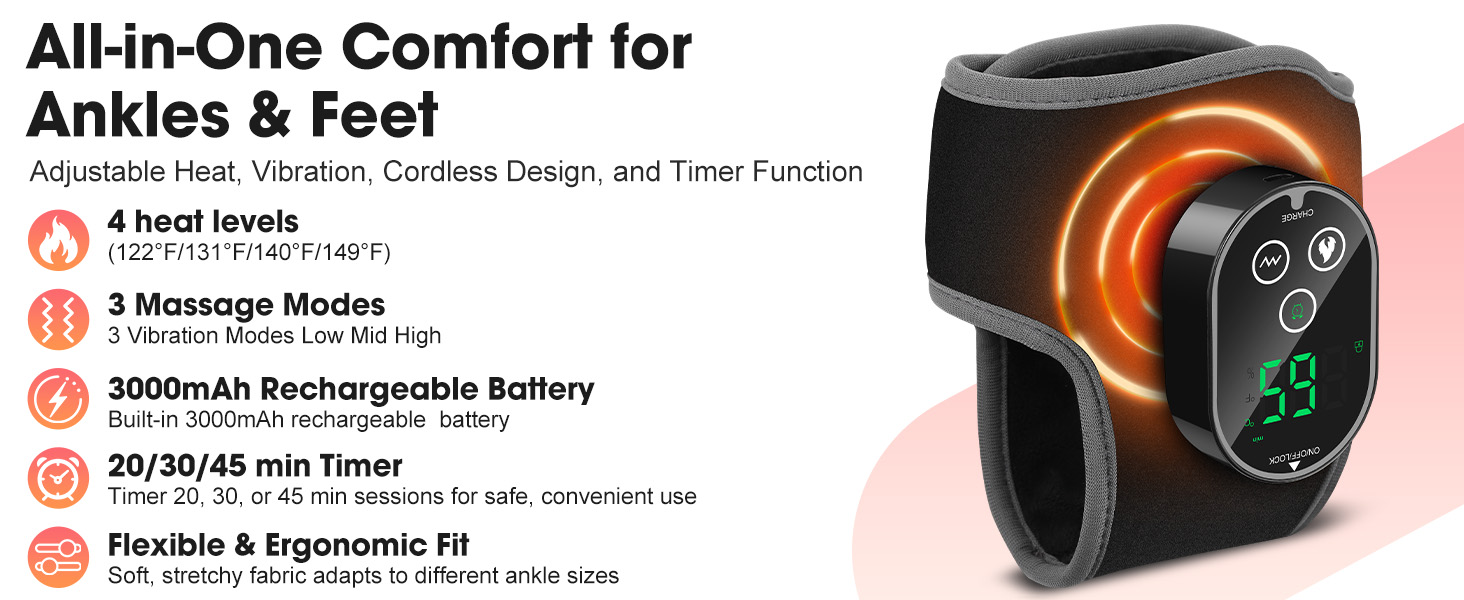 3 Massage Modes for Enhanced Comfort: Equipped with 3 vibration massage modes that work alone or with heat, delivering a complete foot and ankle massager experience for relaxation and recovery. Whether used after fitness training or at the end of a long day, the combination of heat and massage helps refresh the feet and improve overall comfort