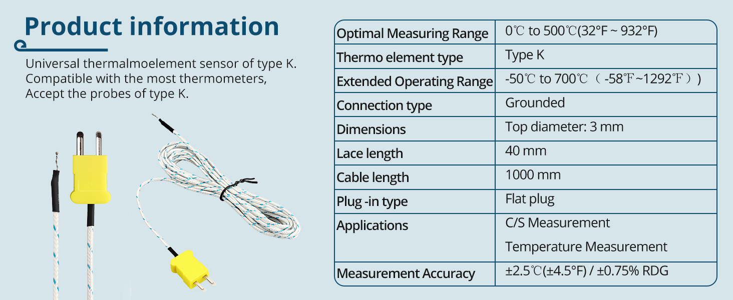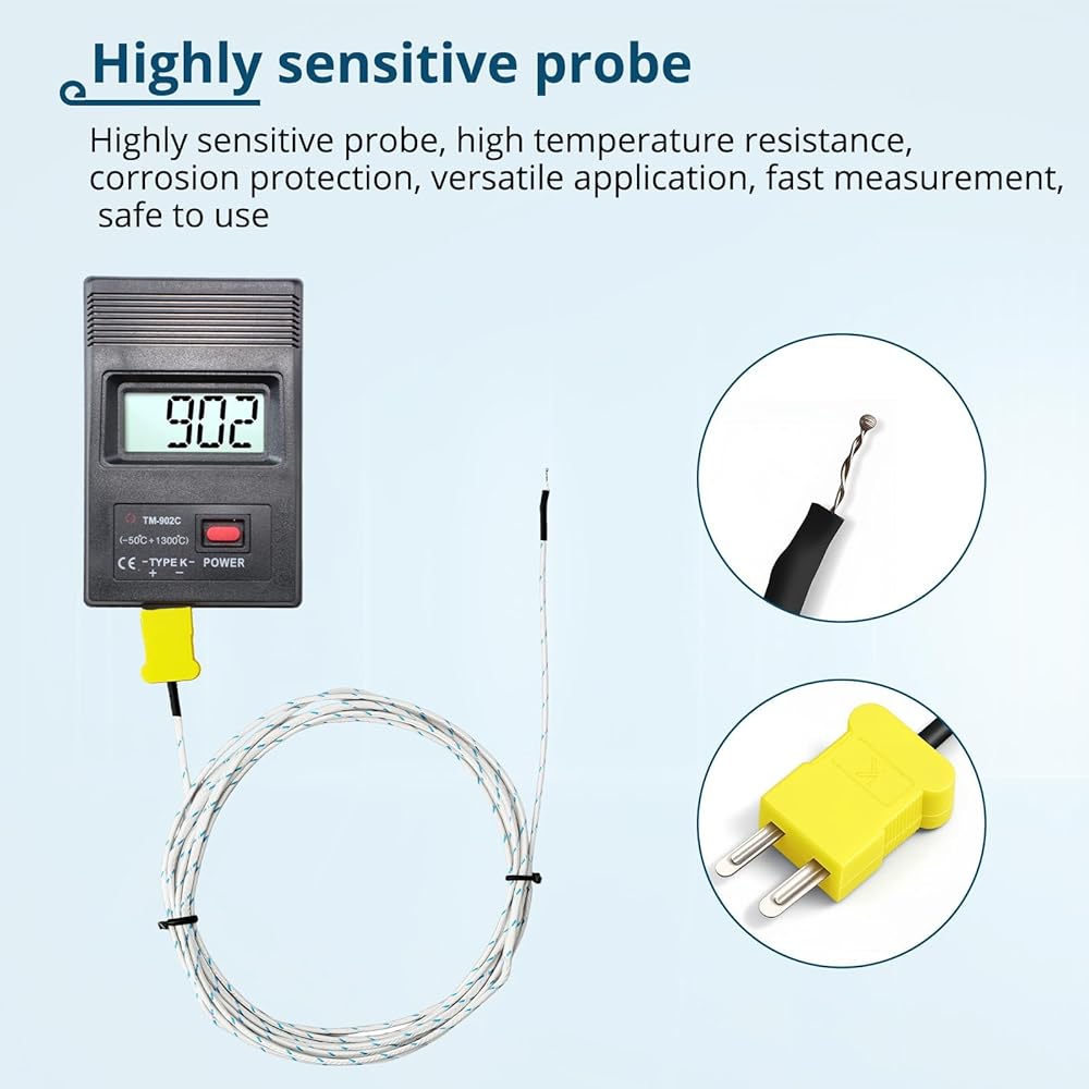 توافق عالمي - مجهز بموصل قياسي صغير الشفرة، هذا المسبار الحراري متوافق مع معظم موازين الحرارة من النوع K، ومسجلات البيانات، وأجهزة التحكم، بما في ذلك النماذج الشائعة مثل TM902C، وTES1310، وTM6801، وغيرها الكثير (راجع دليل جهازك للحصول على دعم من النوع K).