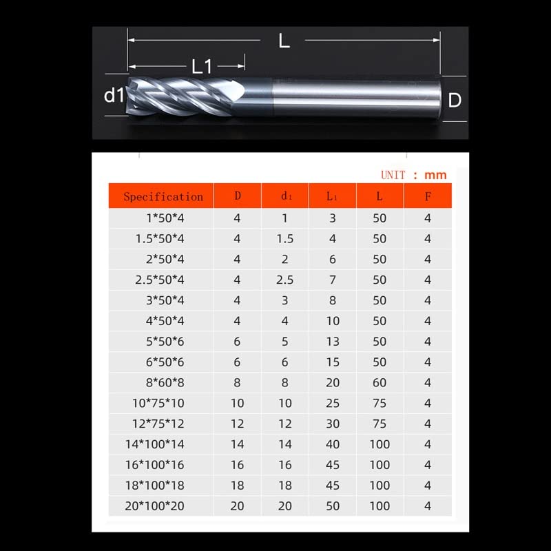 • D = diameter L = length. 4 Flutes. Max cutting material hardness: HRC50.