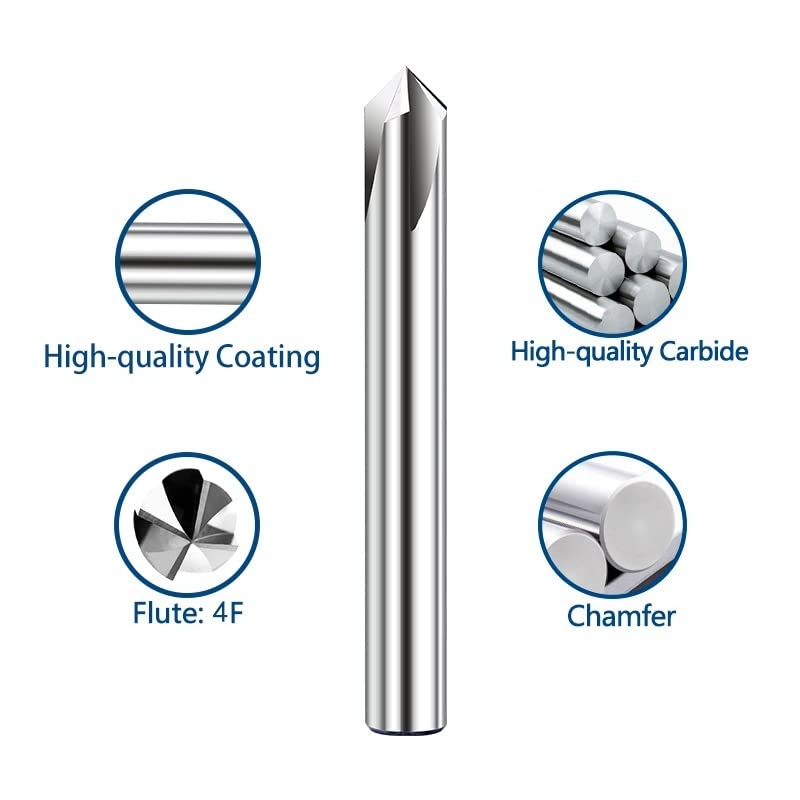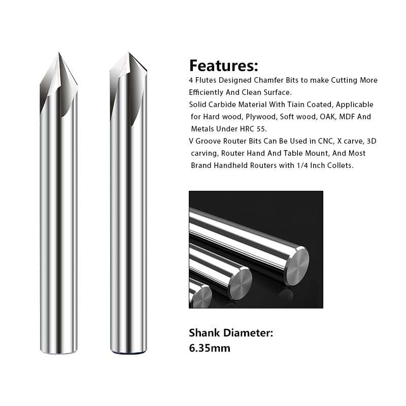 - 4 Flutes Designed Chamfer Bits to make Cutting More Efficiently And Clean Surface.