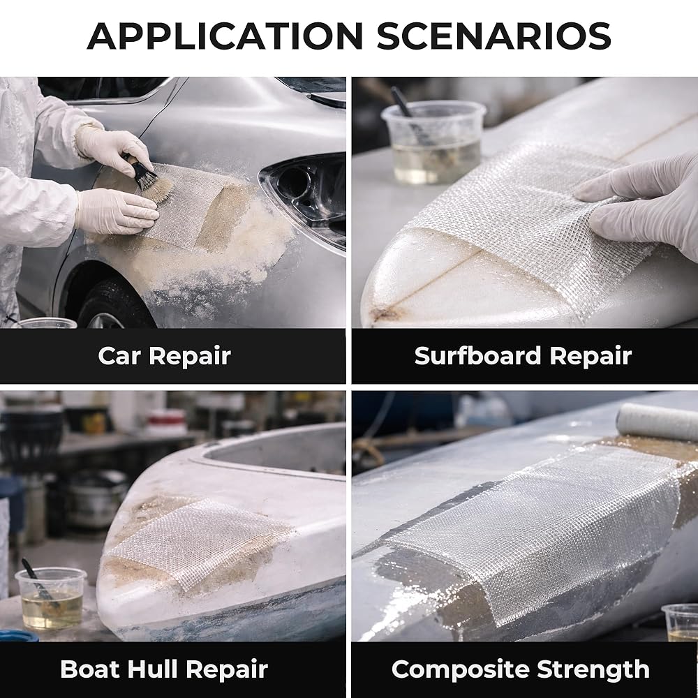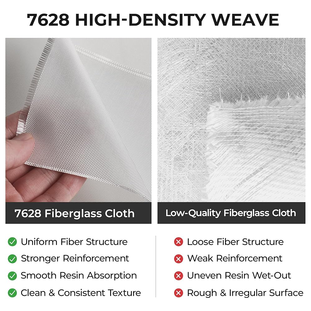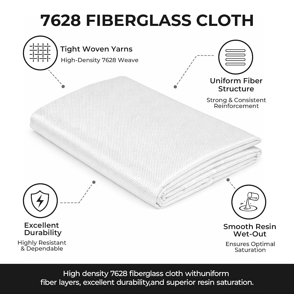 6oz fiberglass cloth, 50 sq ft E-glass plain weave fabric, 50 inch wide 3.3 yards length. 7628 alkali-free fiberglass cloth, heat resistant, corrosion resistant, insulation, flame retardant, lightweight high strength, no rust no rot. Suitable for boat repair, RC plane, auto, surfboard, tub, pool, crack and hole repair. Compatible with epoxy, vinyl ester, polyester resin. Durable flexible smooth fabric for DIY and industrial use