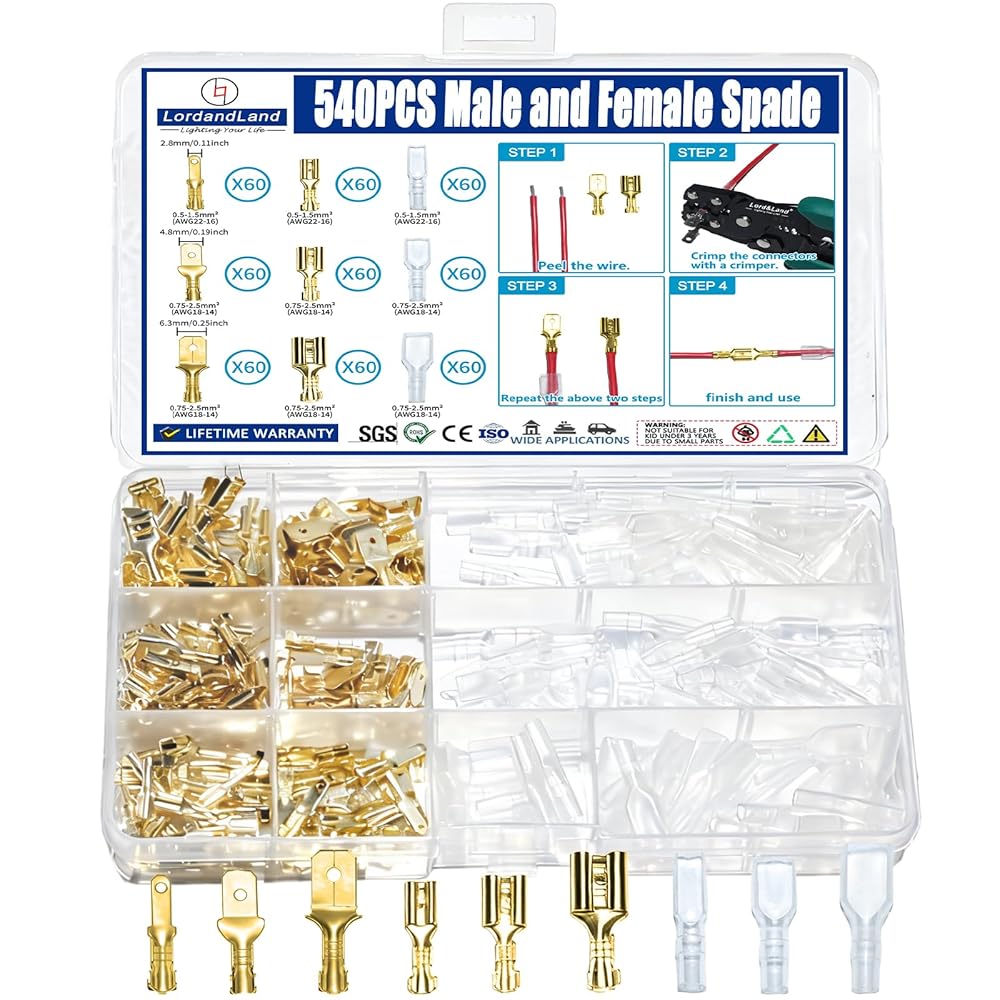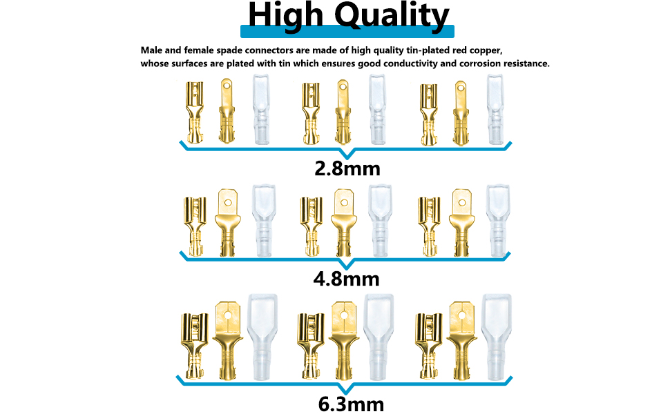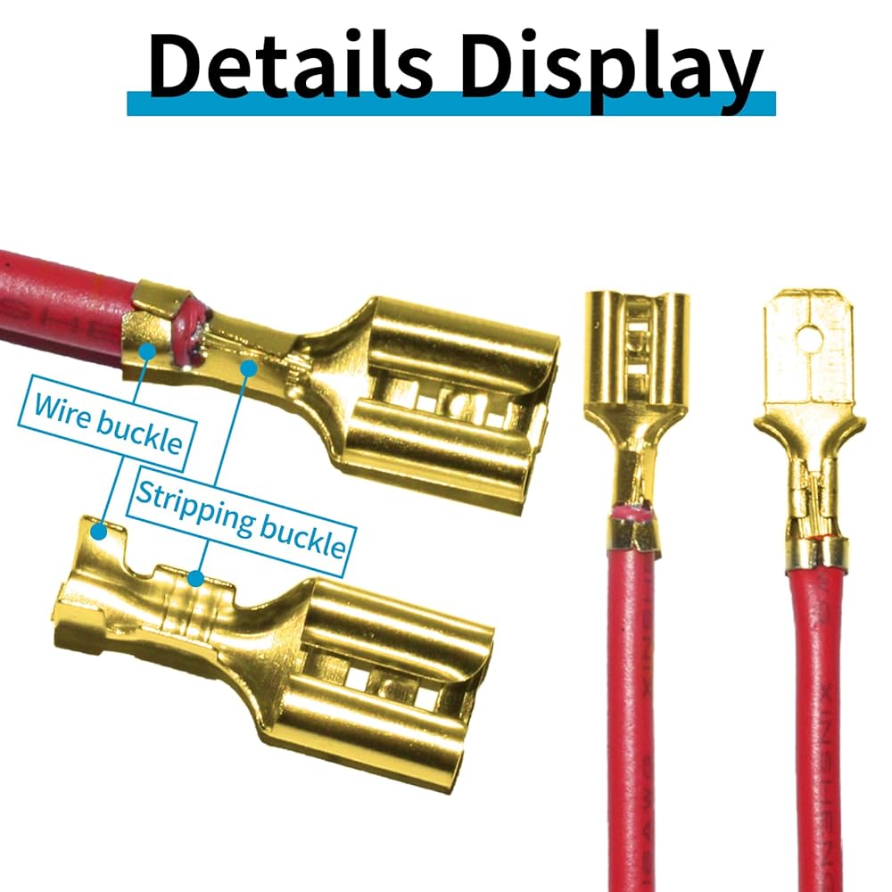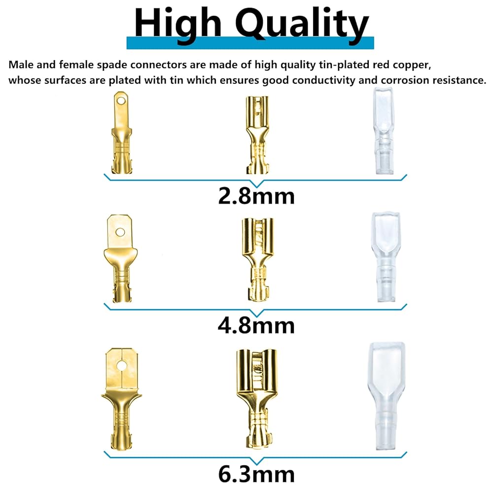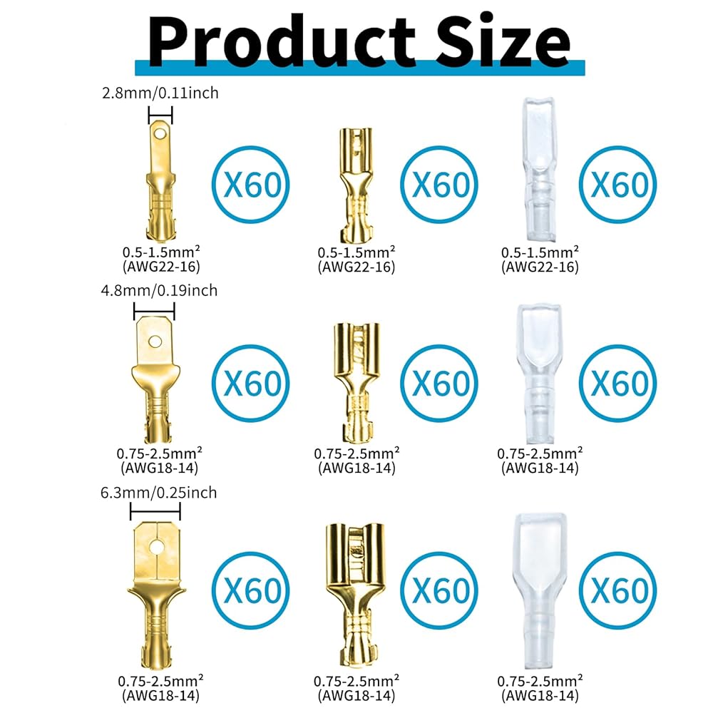 اختر من بين ثلاثة أحجام سهلة الاستخدام (2.8 مم، 4.8 مم، 6.3 مم): تناسب موصلات المجرف الذكور والإناث سلك قياس 22-14، مما يجعلها مثالية لكل شيء بدءًا من إصلاحات السيارات وحتى إعدادات الصوت المنزلية. مهما كانت احتياجاتك من الأسلاك، يوجد هنا الحجم المناسب لهذه المهمة.