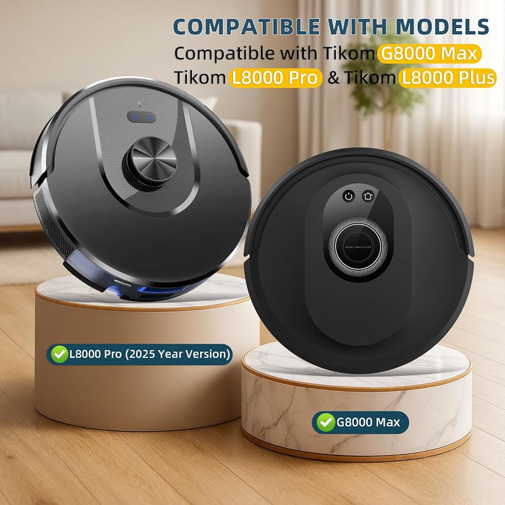 Compatible Models: These premium replacement accessories are compatible with Tikom G8000 Max, Tikom L8000 Pro, Tikom L8000 Plus (2025 version) and Uninell UR1 robot vacuums. Each kit includes 2 durable main brushes, 6 flexible side brushes, 6 high-efficiency HEPA filters, and 6 ultra-absorbent mop pads, providing a complete solution for regular maintenance and helping your robot maintain strong cleaning performance.
