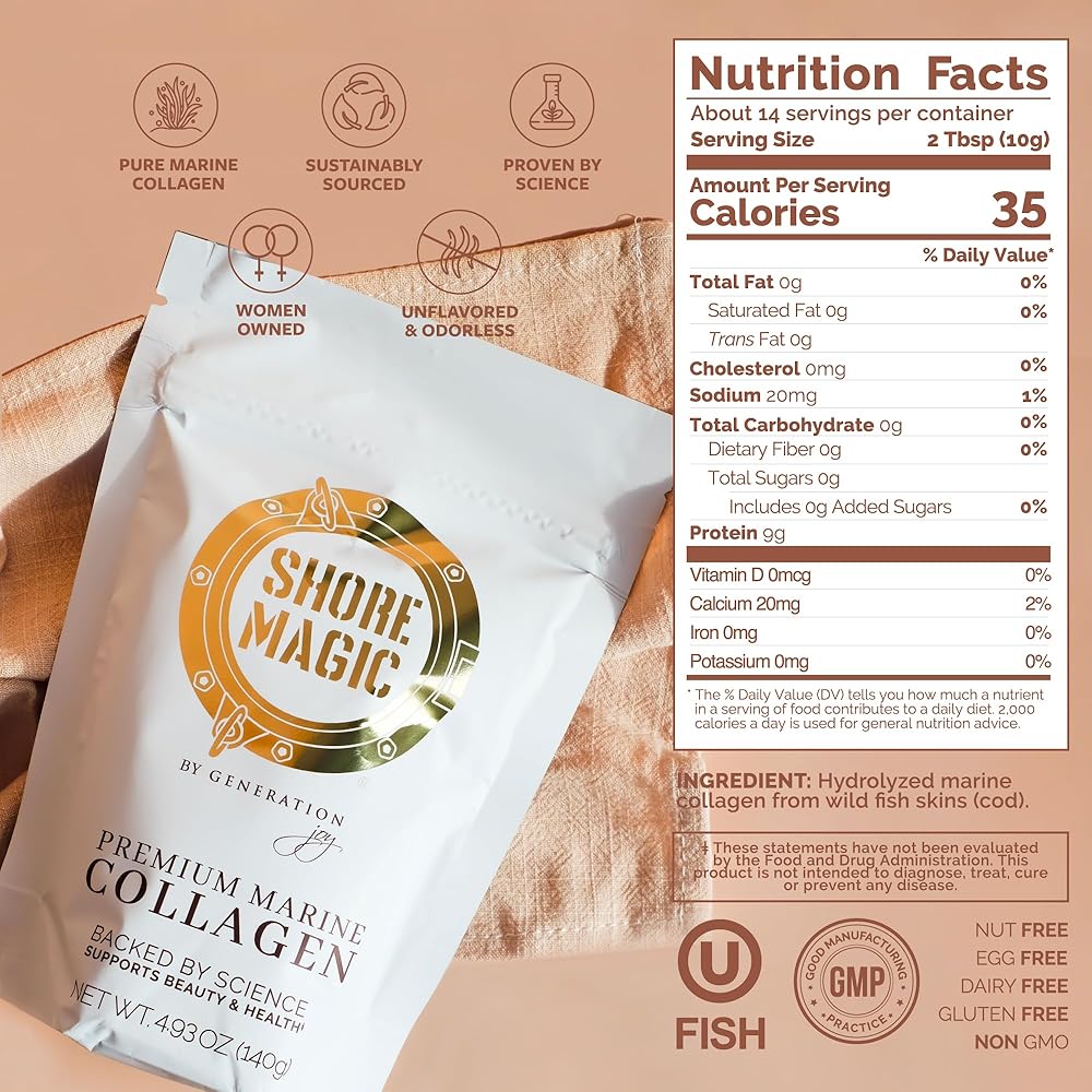 مسحوق الكولاجين البحري الفاخر من شور ماجيك - الببتيدات المتحللة من النوع الأول والثاني والثالث والرابع من الأسماك البرية للبشرة والشعر والأظافر والمفاصل، 14 حصة