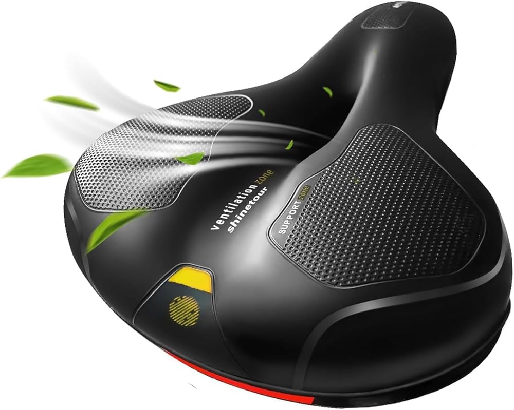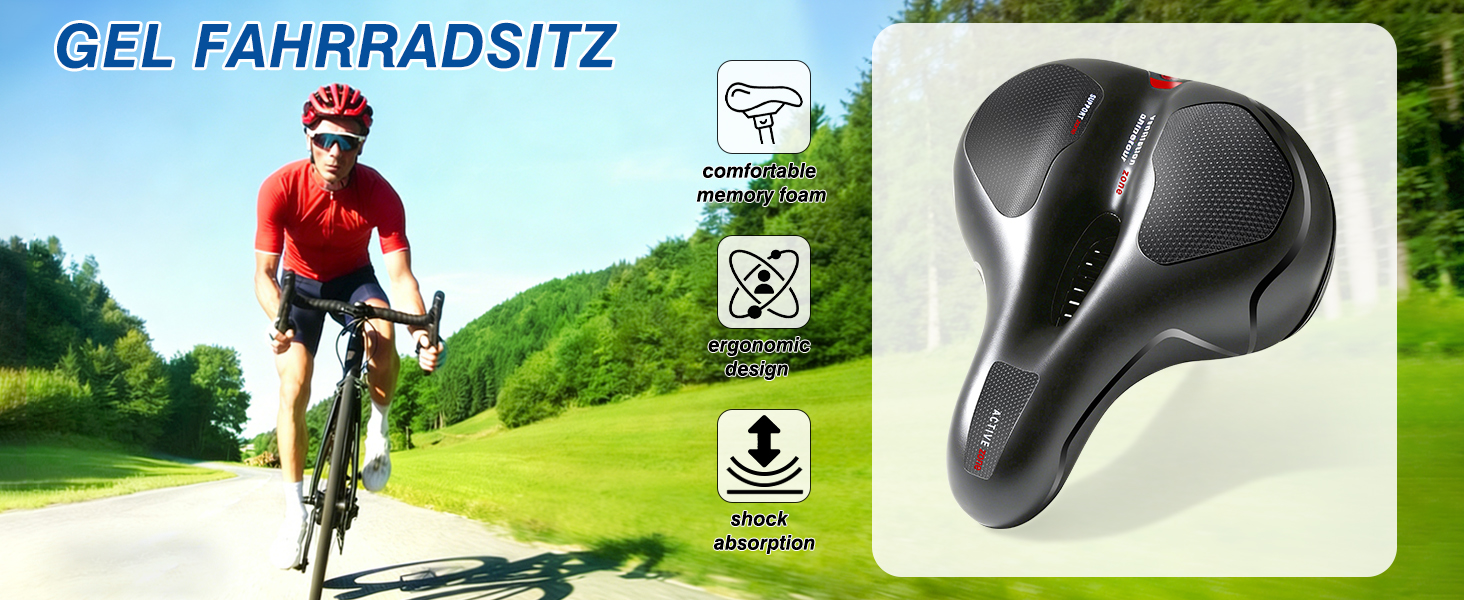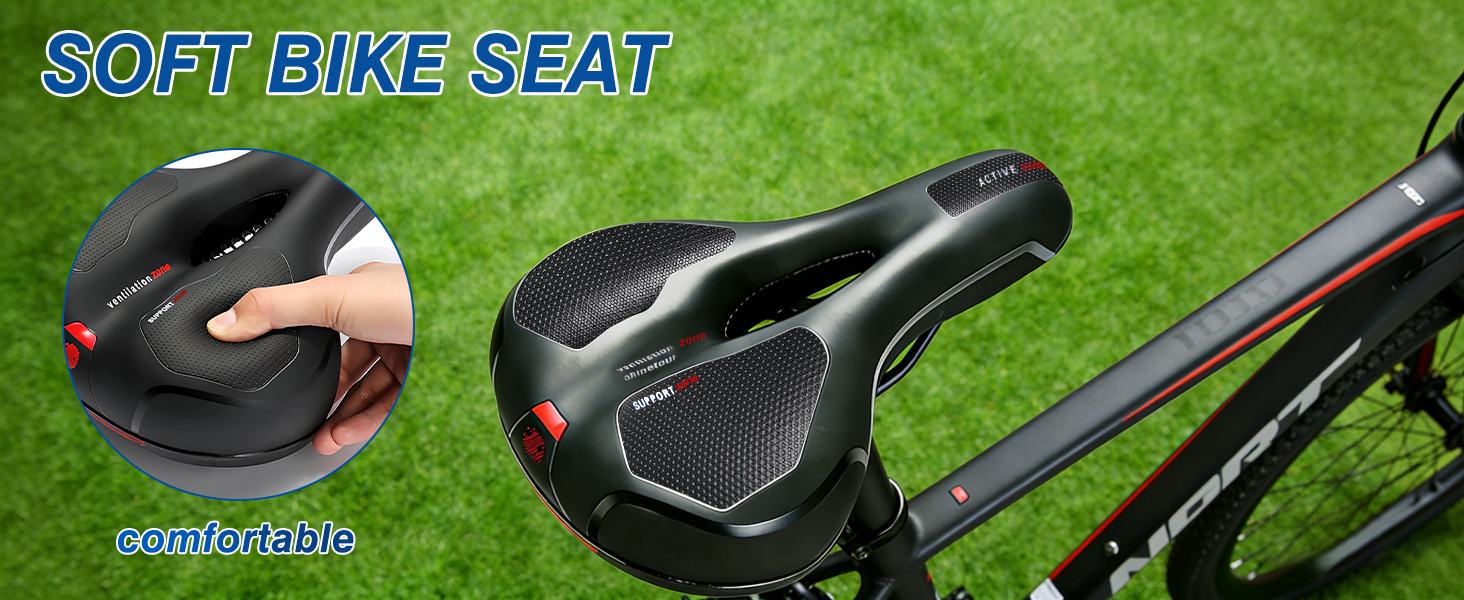 1.[مريح وناعم]: سرج الدراجة مملوء بإسفنج الذاكرة عالي الكثافة، والذي يمكنه تعزيز الراحة وامتصاص الصدمات بشكل نهائي، وهو فعال جدًا في تقليل الضغط على البروستاتا وعظمة العانة، ووجه المقعد مصنوع من جلد PVC، مقاوم للماء، وناعم، ومتين.