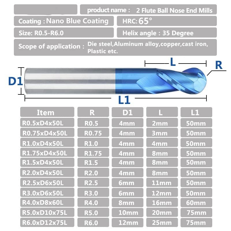 2 Flute Nano Blue Coat Ball Nose Spiral End Mill Set Carbide CNC Machine Router Bit Bits for Wood Working Acrylic MDF PVC