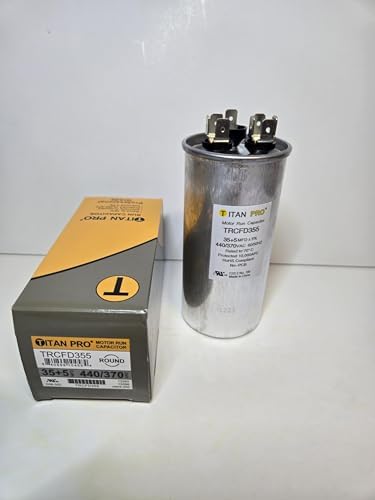 TitanPro TRCFD355 HVAC Round Dual Motor Run Capacitor. 35/5 MFD/UF440/370 Volts Specifications: Diameter- 2.11" Height- 4.13" Add 1/2 inch to height for terminal length. Round in shape. There are 1/4" male terminals on the capacitor. Rated at 35/5 MFD/uf 440/370 Volts 50/60HZ. Features: Heat tolerant, tested up to 60,000 hours of run time. Cans are made of high-grade metallized polypropylene film and proprietary Epoxidized Soybean Oil (ESO). Three tri-blade terminals (c, h, f) Rated to 158 Degrees (Fahrenheit), Protected to 10,000 AFC. Meets UL 810 safety standards. NON PCB Long Life Operation. Product Details Brand TitanPro Manufacturer Packard Product Type Run Capacitor Mpn TRCFD355 TitanPro TRCFD355 HVAC Round Dual Motor Run Capacitor. Diameter- 2.11" Height- 4.13" Add 1/2 inch to height for terminal length. There are 1/4" male terminals on the capacitor. Rated at 35/5 MFD/uf 440/370 Volts 50/60HZ. Rated to 158 Degrees (Fahrenheit), Protected to 10,000 AFC.