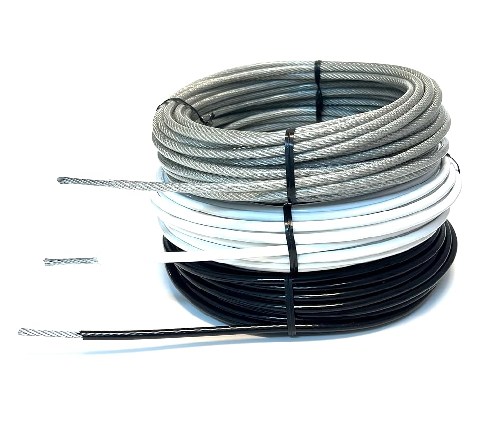 MATERIAL COMPOSITION: Galvanized steel cable core with durable vinyl coating, providing protection and enhanced appearance