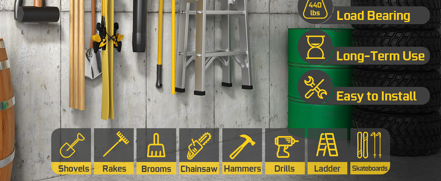 تعظيم الاستفادة من المساحة: قم بتنظيم جميع معداتك أو أدواتك على رف التخزين لتحرير مساحة الأرضية وتوفير سهولة الوصول. مناسبة لوضع أدوات الحدائق والمكانس والمجرفة والخرطوم وحتى المعدات الرياضية مثل عصي هوكي الجليد ومعدات التزلج. يلبي احتياجات تخزين الأدوات الخارجية المختلفة