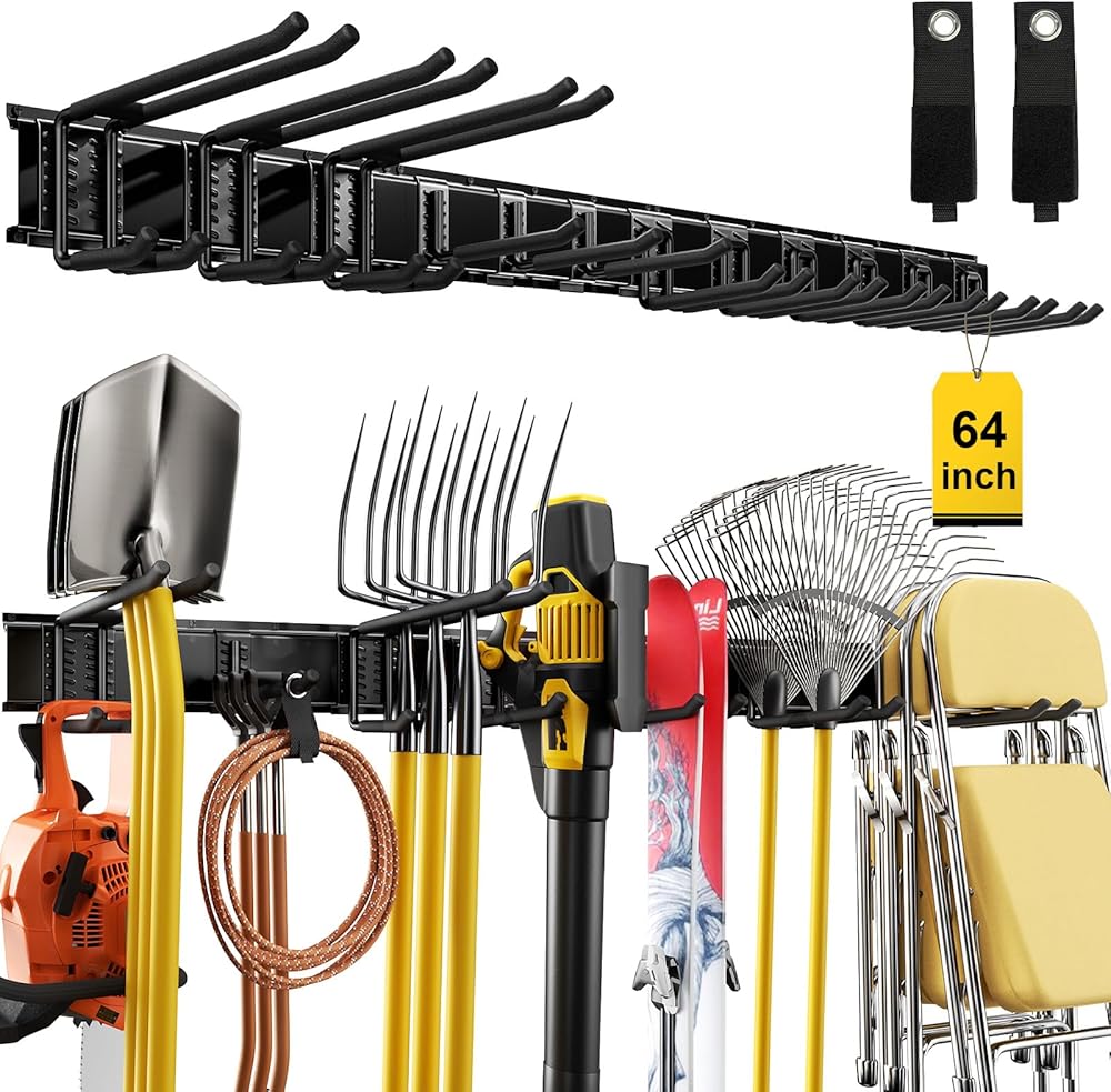 منظم تخزين المرآب متعدد الوظائف: يبلغ الطول الإجمالي لتركيب رفوف الحائط 64 بوصة. يبلغ طول المسار الفردي 40.64 سم ويحتوي على إجمالي 12 خطافًا (6 خطافات أدوات، 3 خطافات مزدوجة الطبقة، 3 خطافات فردية)، شريطين، و4 مسارات، والتي يمكن استخدامها في المرآب والحديقة وغرف تخزين الأدوات