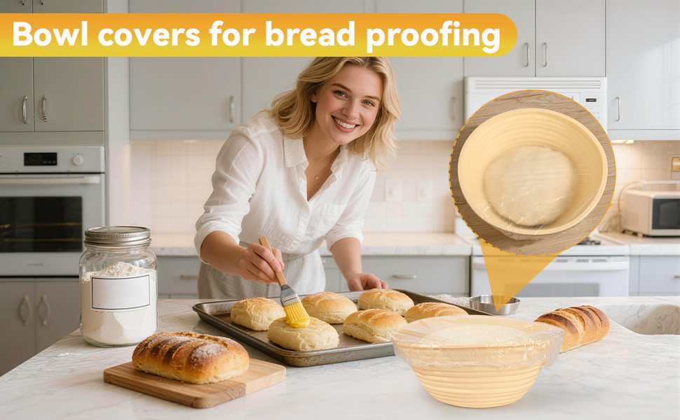 لوازم خبز الخبز العجين المخمر: يمكن أن تساعد أغطية الأوعية لحماية الخبز في الحفاظ على رطوبة العجين في الوعاء، ومنع العجين من الجفاف أثناء عملية التثبيت، وخلق أفضل بيئة للعجين لتتخمر.