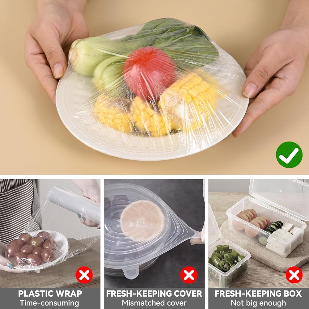 أغطية الأوعية المرنة: حافة أغطية الأوعية البلاستيكية عبارة عن سلك مرن قابل للتمدد، مما يجعلها مناسبة للأطباق والأطباق وسلة مقاومة الخبز بأحجام مختلفة، تحتاج فقط إلى تمديدها على طول طرفي غطاء الوعاء. يتناسب الحبل المرن بشكل وثيق مع حافة الطبق، ويحمي الطعام في الطبق ويمنع الغبار