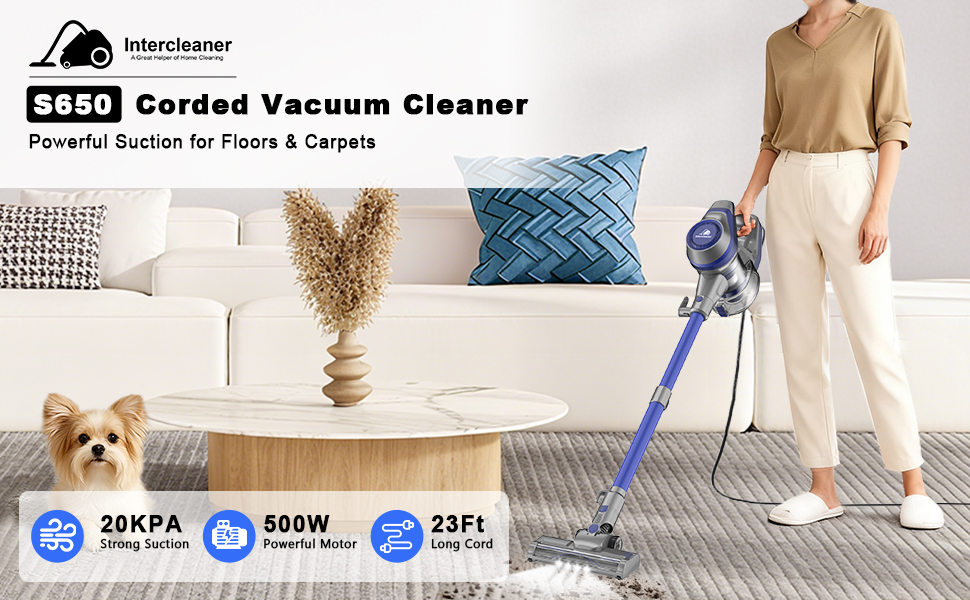 مكنسة كهربائية بسلك بطول 23 قدم من Intercleaner، مع مصابيح أمامية LED وكوب غبار كبير، شفط قوي للأرضيات الصلبة والسجاد، عصا قابلة للتعديل، مثالية لشعر الحيوانات الأليفة، تخزين مثبت على الحائط