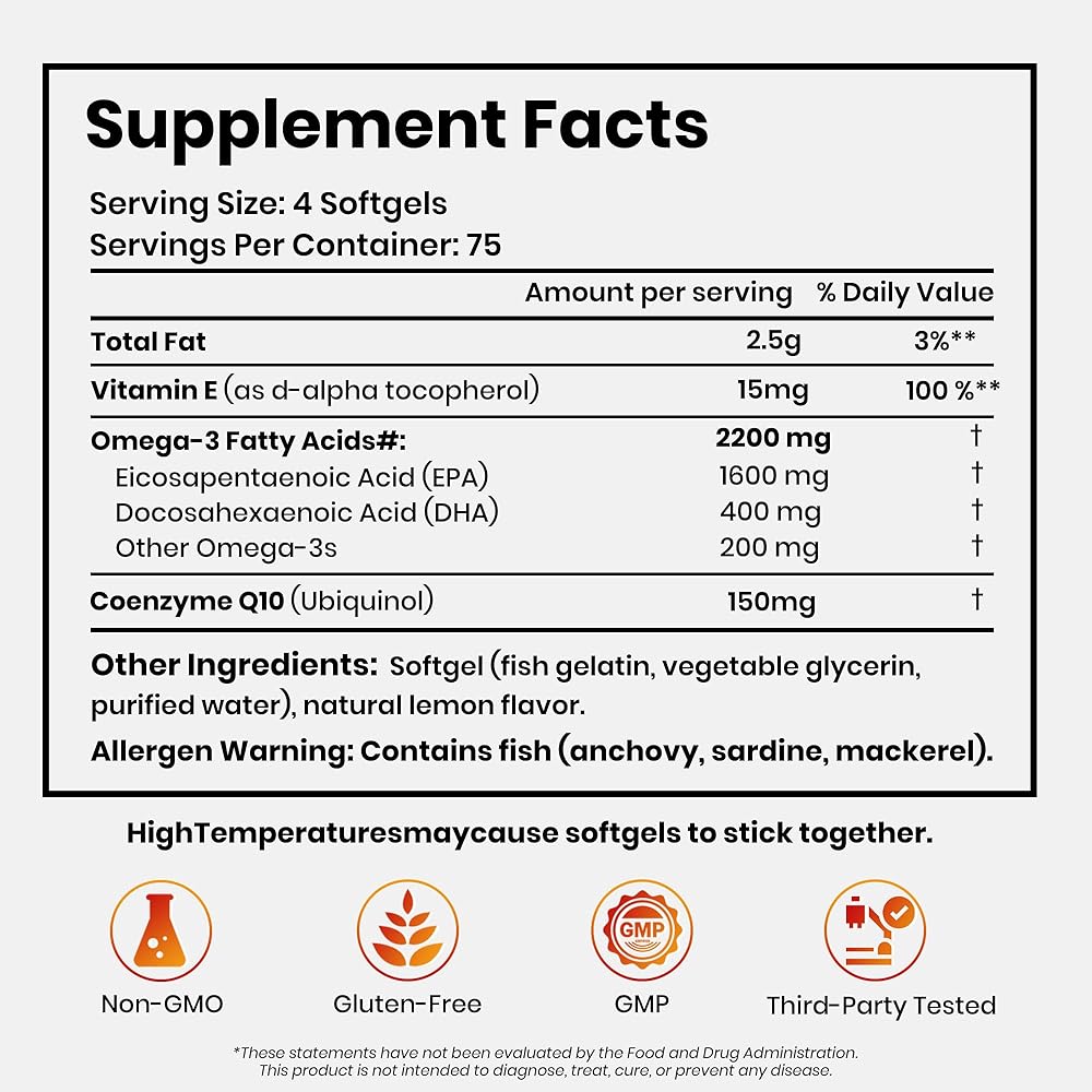 Omega 3 Fish Oil with CoQ10, High EPA DHA Fish Oil Omega 3 Supplements, 2200 mg rTG Omega 3 EPA DHA for Heart & Cardiovascular Support, Lemon Flavor, 300 Softgels