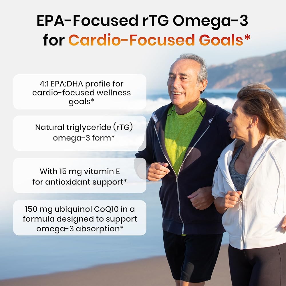 OMEGA 3 EPA DHA WITH UBIQUINOL COQ10 & VITAMIN E – This fish oil omega 3 supplement adds 150 mg ubiquinol CoQ10 and 15 mg vitamin E per daily serving to support heart cell energy and antioxidant protection, offering a more complete formula than basic fish oil supplements.*