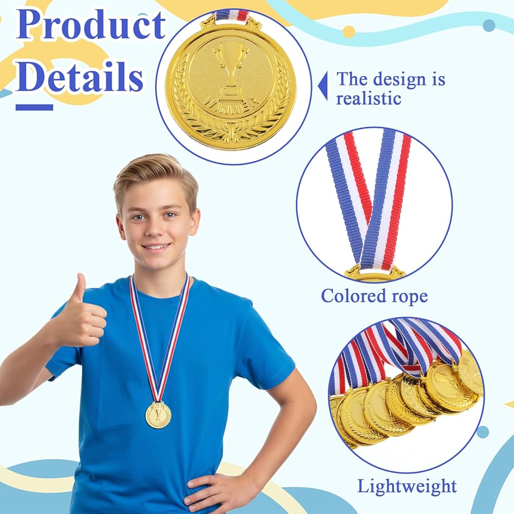 • Versatile Award Gold Medal Uses: These gold medals for awards are perfect for school sports days, classroom competitions, talent shows, spelling bees, swim meets, and birthday parties. Use them to recognize first place, participation, improvement, or teamwork - any occasion becomes more memorable with a gold medal.
