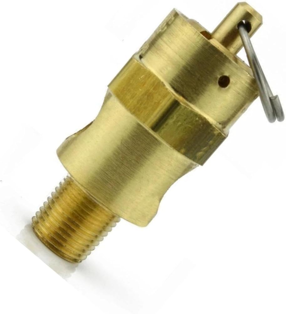 • 1/8" Male NPT Threaded 125 PSI air compressor / tank pressure safety relief valve. Also known as a "Pop Off" or "Blow Off" valve. The relief pressure of this valve is set at 125 PSI and is accurate within + or - 3% of the set pressure. Specifications: This valve will relieve 112 SCFM Valve Inlet Threads: 1/8" Male NPT (measure about 3/8" in diameter) Total Valve Length: 1-3/4" Installation Wrench Size: 11/16" Features a silicone rubber soft seat relief valve to prevent leaks Max temperature: 250° F Solid Brass Construction