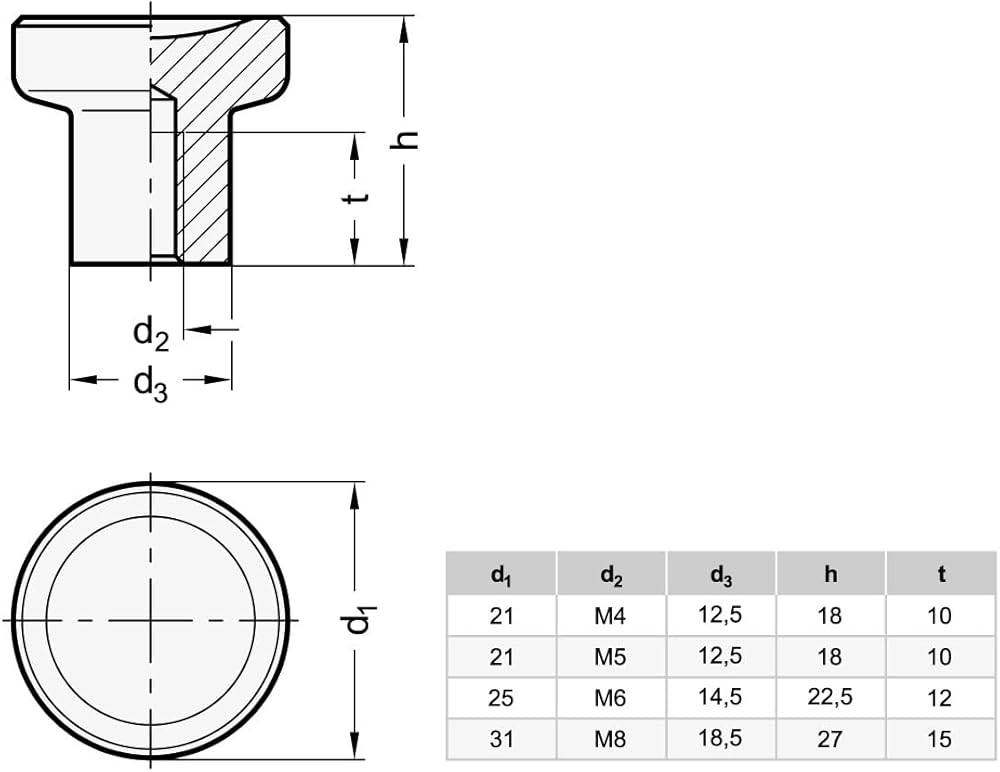 - Handle diameter d1: 31 mm; thread d2: M8; diameter d3: 18.5 mm; total height h: 27 mm; thread depth: 15 mm