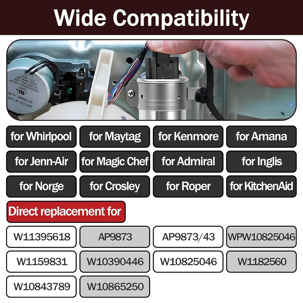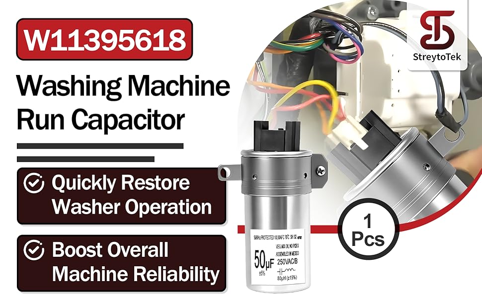 - توافق الطراز الواسع: يستبدل هذا المكثف W11395618 لـ Whirlpool أرقامًا مثل 4931353 PS12731163 W10843769 W10866250 W11315694 W11162560 W10625046 W11158831 W10390446 AP6973143 EAP12731163 WPW10625046، يناسب غسالات Whirlpool Maytag Kenmore