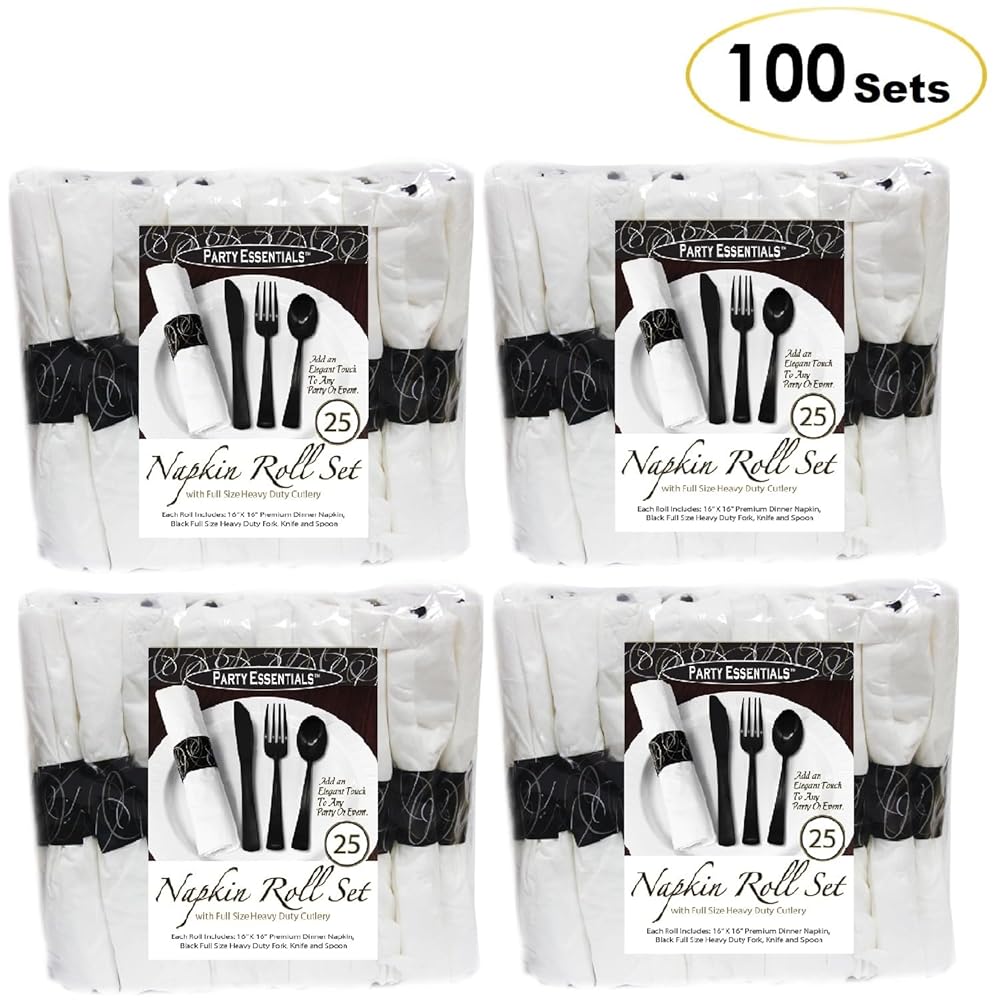 مجموعة أدوات مائدة بلاستيكية شديدة التحمل ملفوفة مسبقًا للاستخدام مرة واحدة من بارتي إيسنشيالز مع شوكة/سكين/ملعقة سوداء ومنديل أبيض ثلاثي الطبقات (علبة مكونة من 100 لفة)