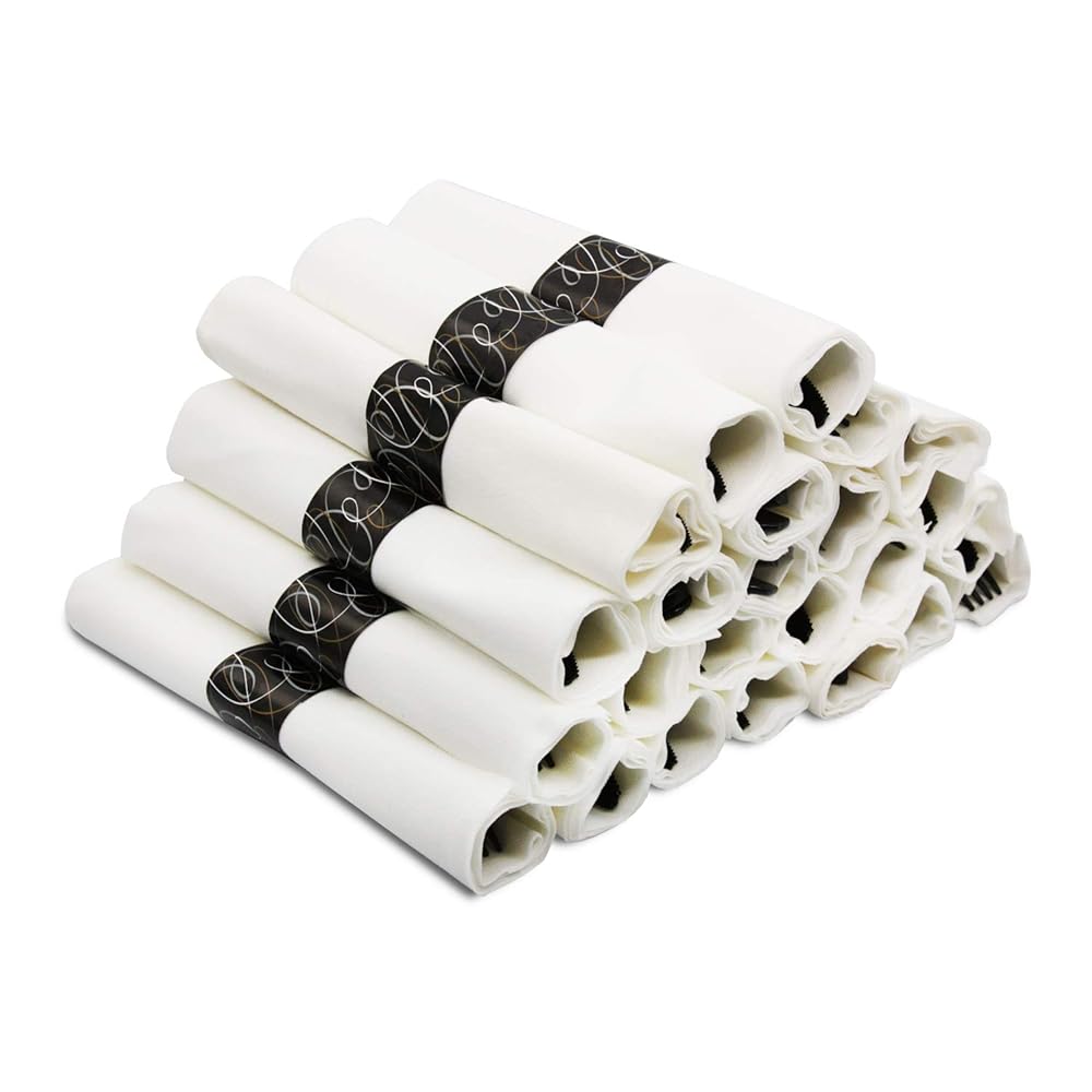 • Each roll includes: one piece 3-ply 16" x 16" white napkin and a black full size extra heavy duty fork, knife and spoon.