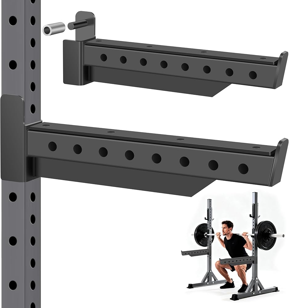 【Single Locking Design & Perfect Dimensions】Features a simple and reliable single locking design for easy operation. Each safety arm measures 18.1" in length, compact and space-saving, fitting well with 2" x 2" power racks without taking extra space.