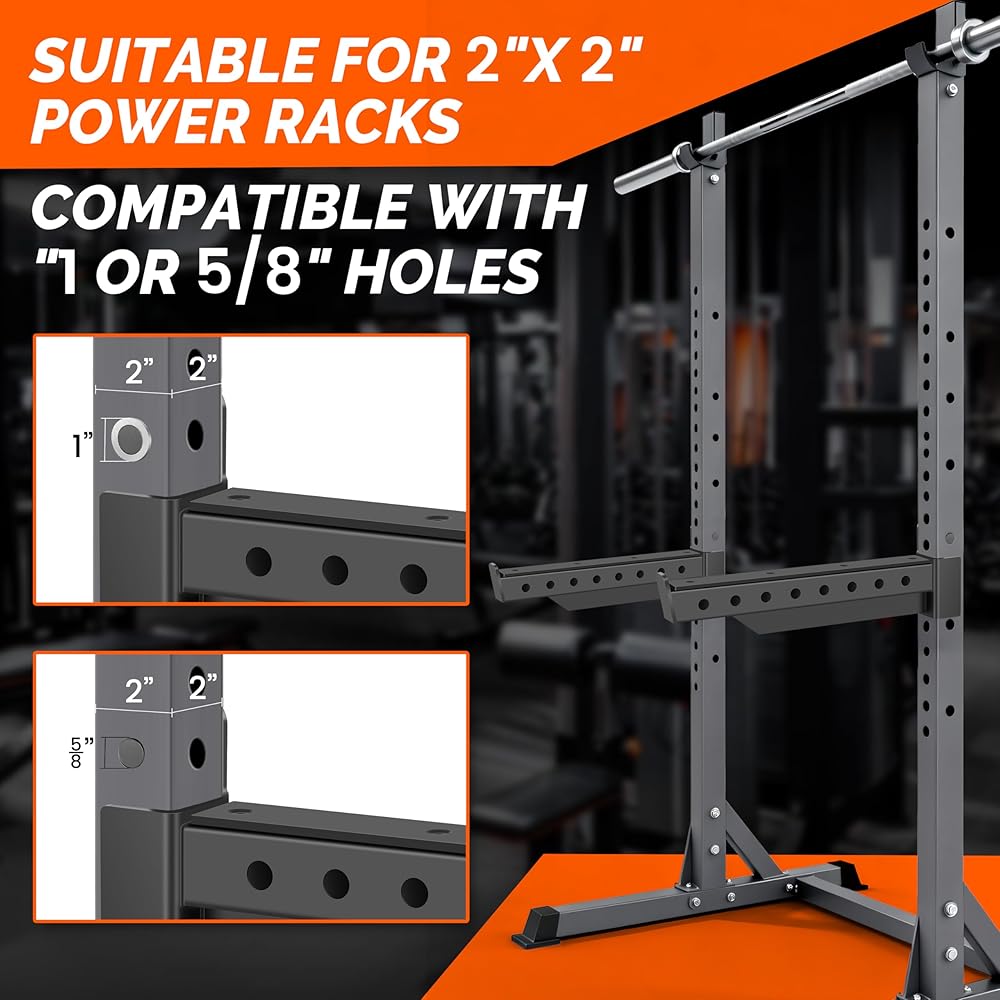 【Universal Fit for 2" x 2" Power Racks】Exclusively designed for 2" x 2" power racks, these squat rack attachments are compatible with both 5/8" and 1" holes. A metal sleeve is attached to the 5/8" pin, and you can fit the metal sleeve to perfectly adapt to 1" holes, ensuring a snug and secure fit for these safety spotter arms.