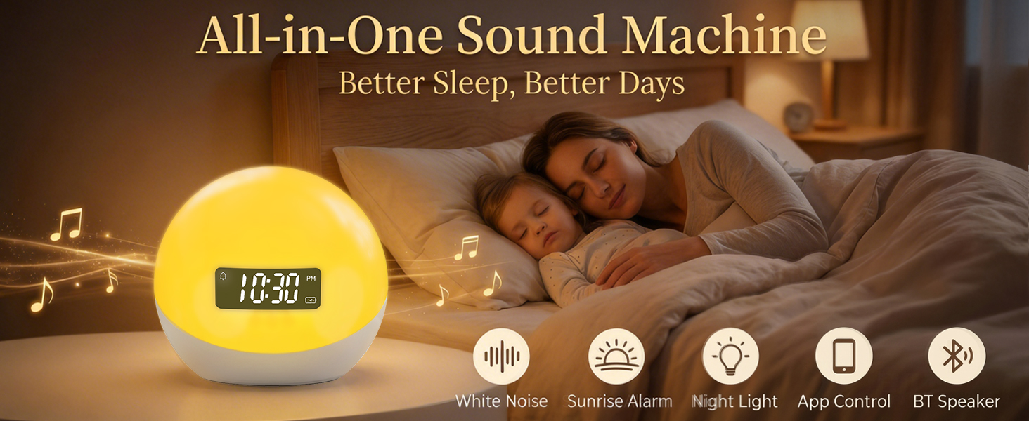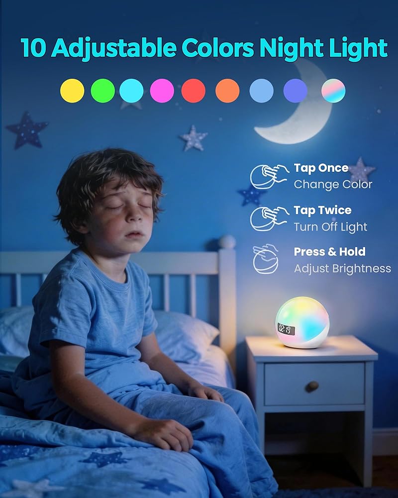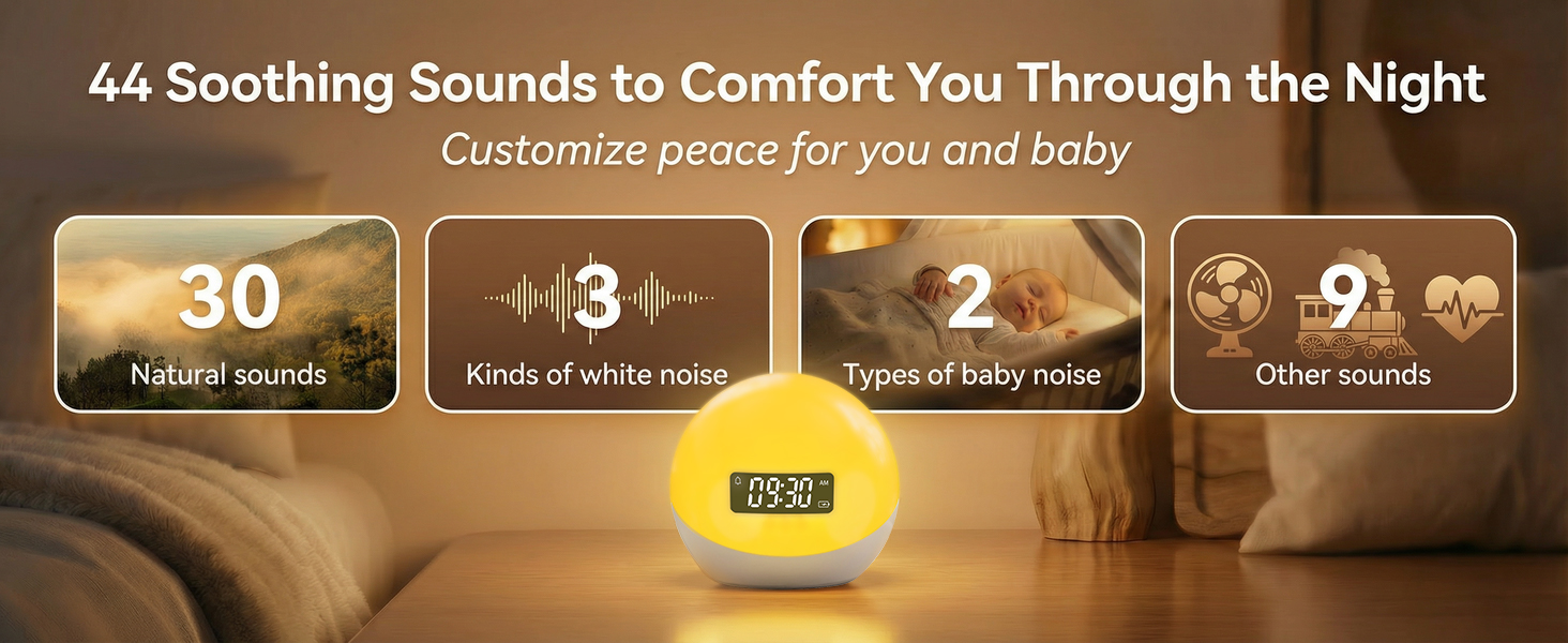 آلة ضوضاء بيضاء مع منبه شروق الشمس، 44 آلة صوت مهدئة غير متكررة للنوم، ضوء ليلي بـ 10 ألوان مع تطبيق ومؤقت، هدايا آلات ضوضاء للأطفال والبالغين في المنزل والمكتب والسفر