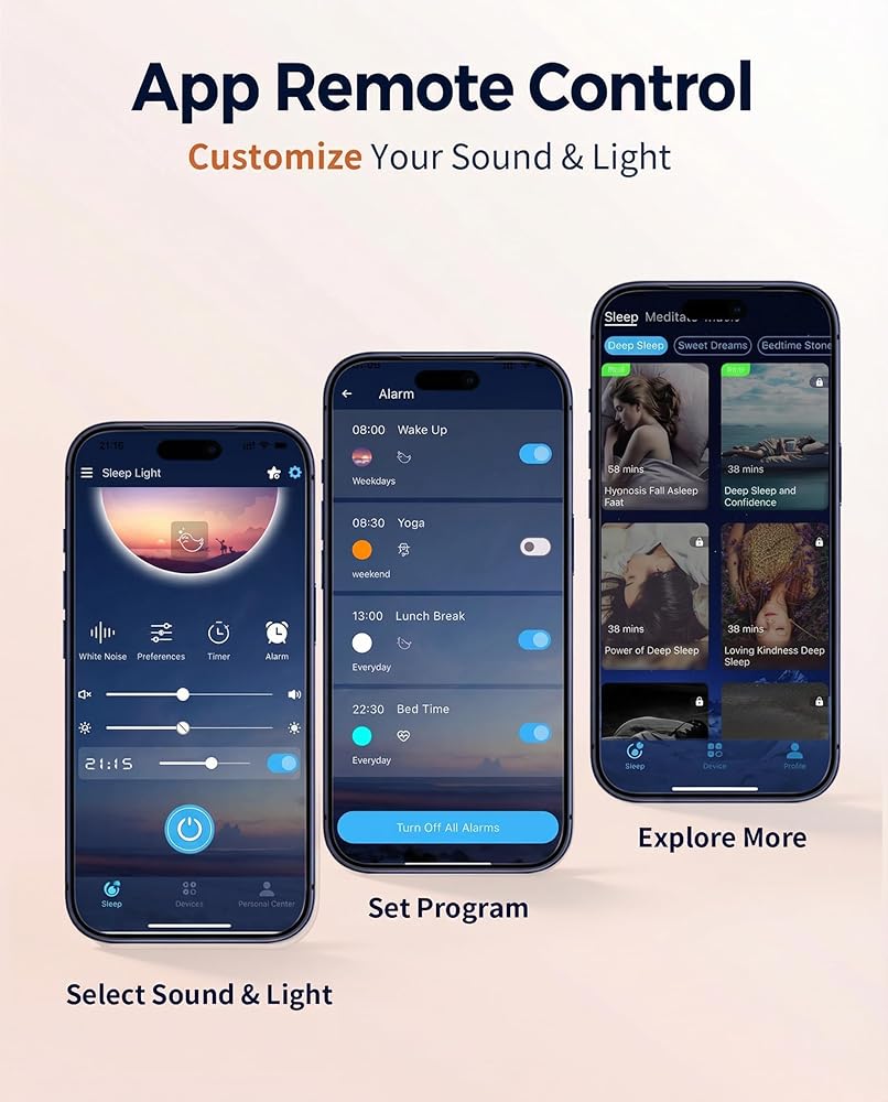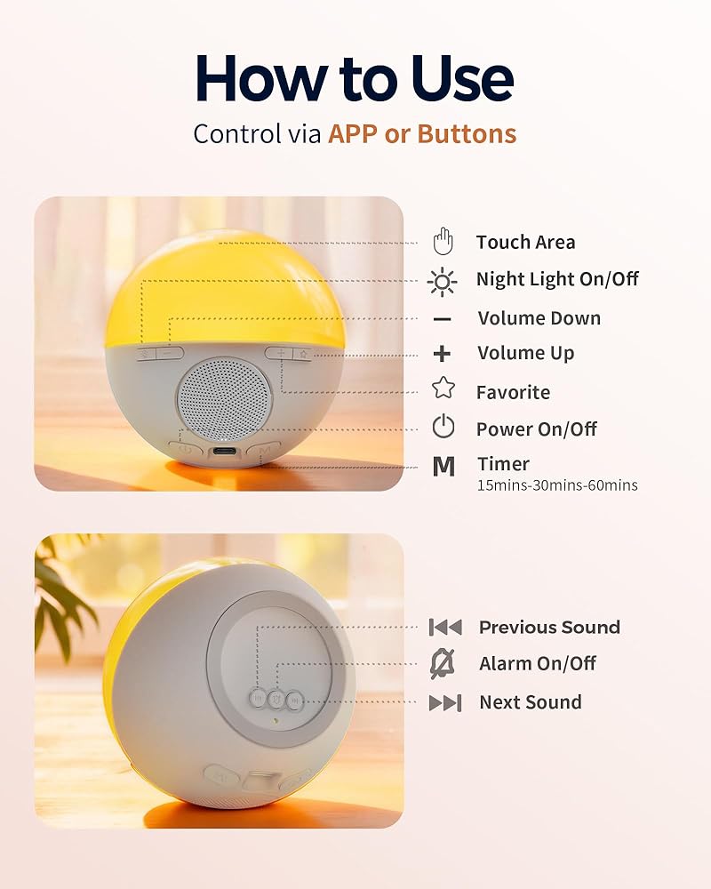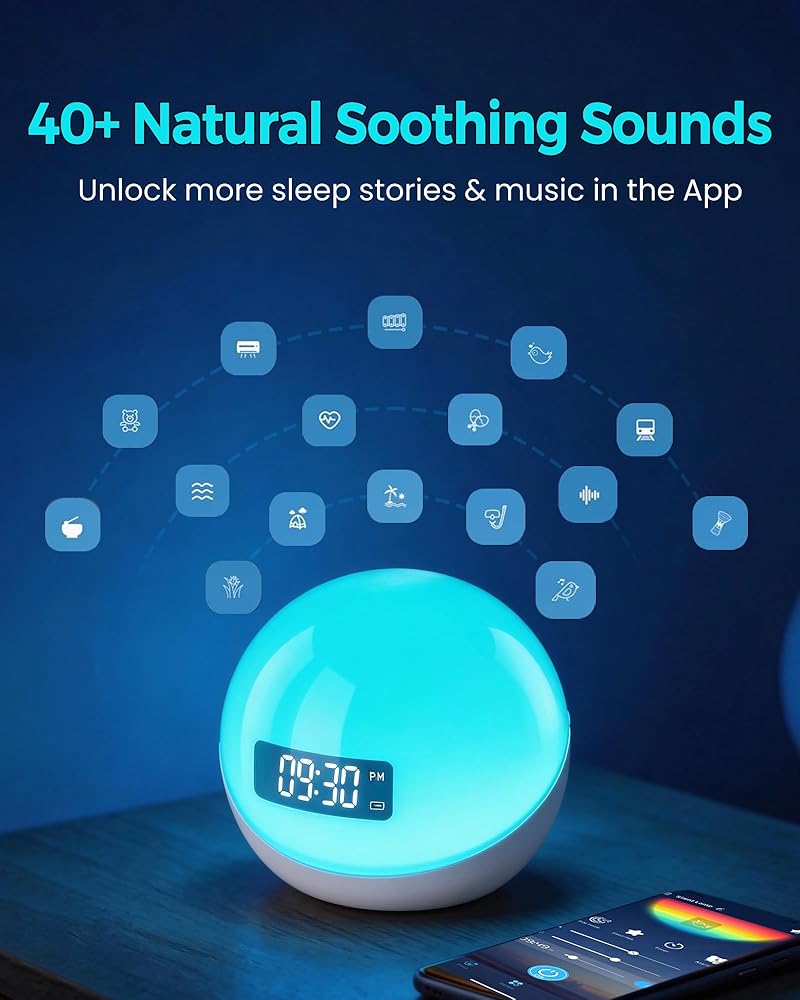 ⏱️【تطبيق ذكي + زر تحكم مزدوج】ساعات منبه يتم التحكم فيها بواسطة التطبيق لغرف النوم - يمكنك ضبط الأصوات والتنبيه والضوء بسهولة عبر التطبيق أو الأزرار. اضبط مؤقت النوم من 15 دقيقة إلى 8 ساعات للحصول على نوم مخصص. يعمل بمنفذ USB-C، مثالي للمنزل أو الحضانة أو السفر.