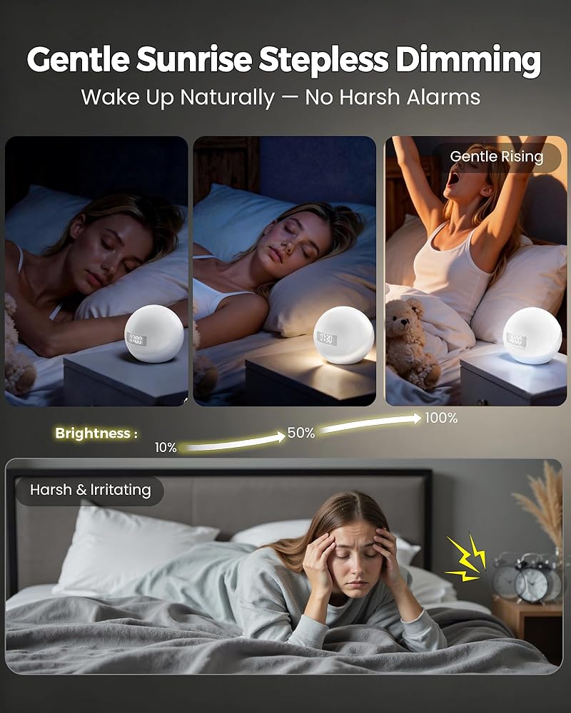 🌅 【استيقظ بشكل طبيعي مع ضوء شروق الشمس】تضيء محاكاة شروق الشمس التدريجية بنسبة 10% → 100% خلال 10-60 دقيقة قبل التنبيه. يتماشى مع إيقاع الساعة البيولوجية من أجل استيقاظ لطيف - المنبه المناسب لشروق الشمس وضوء الاستيقاظ. مثالي للأشخاص الذين ينامون بكثرة، والبالغين، والأطفال، والرضع. لا يوجد ترنح الصباح.