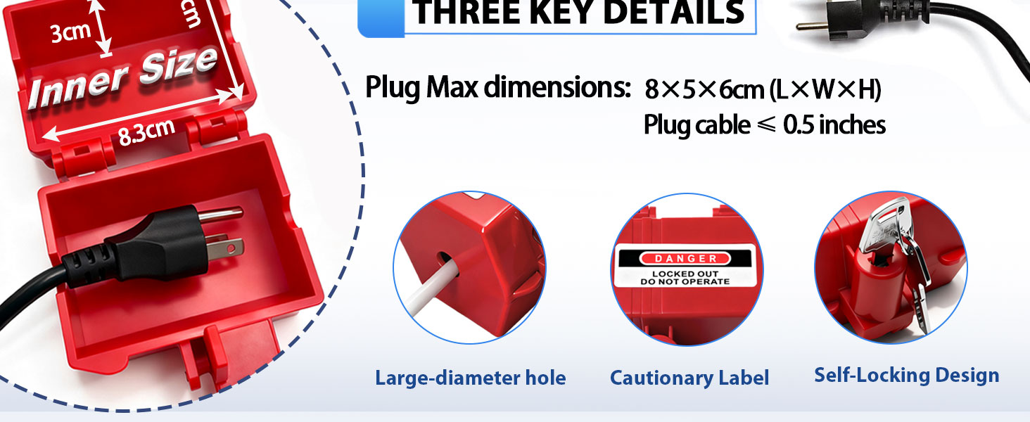 [منع الاستخدام غير المصرح به] تعمل واقيات القابس هذه على قفل قابس الطاقة عندما لا تكون المعدات قيد الاستخدام. تمنع أي شخص من منع الإدخال غير المصرح به في المنافذ. فهو يتحكم في الوصول ويوقف العبث ويعزز السلامة في المصانع وورش العمل والمنازل.