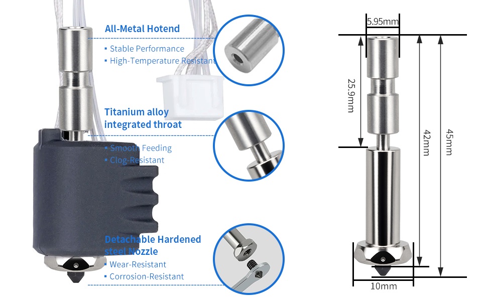 3️⃣ تغذية سلسة ومقاومة للانسداد - يضمن الحلق المدمج من سبائك التيتانيوم تدفقًا سلسًا للخيوط ويقلل من مشكلات الانسداد أثناء جلسات الطباعة الطويلة. يوفر معدل بثق ثابت ونهاية طباعة ممتازة حتى في ظل الطباعة عالية السرعة.