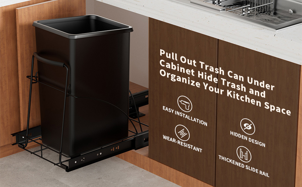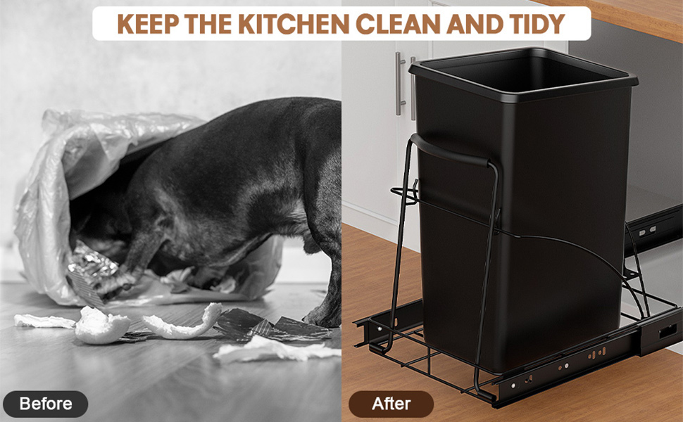 إخفاء سلة المهملات: سلة المهملات التي يمكن سحبها للخارج تناسب بشكل مثالي أسفل الخزانة. إن رف سلة المهملات المنزلق بسعة 35 لترًا ليس متينًا ومريحًا فحسب، بل يخفي أيضًا سلة المهملات الموجودة أسفل الحوض بشكل جيد وفعال ويمنع حيوانك الأليف من لمس سلة المهملات عن طريق الخطأ.