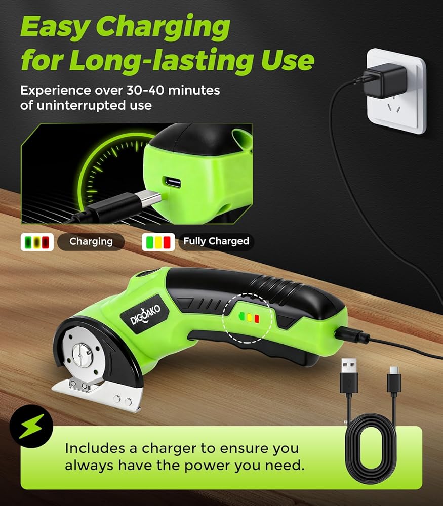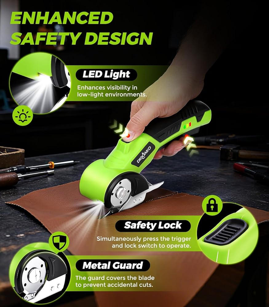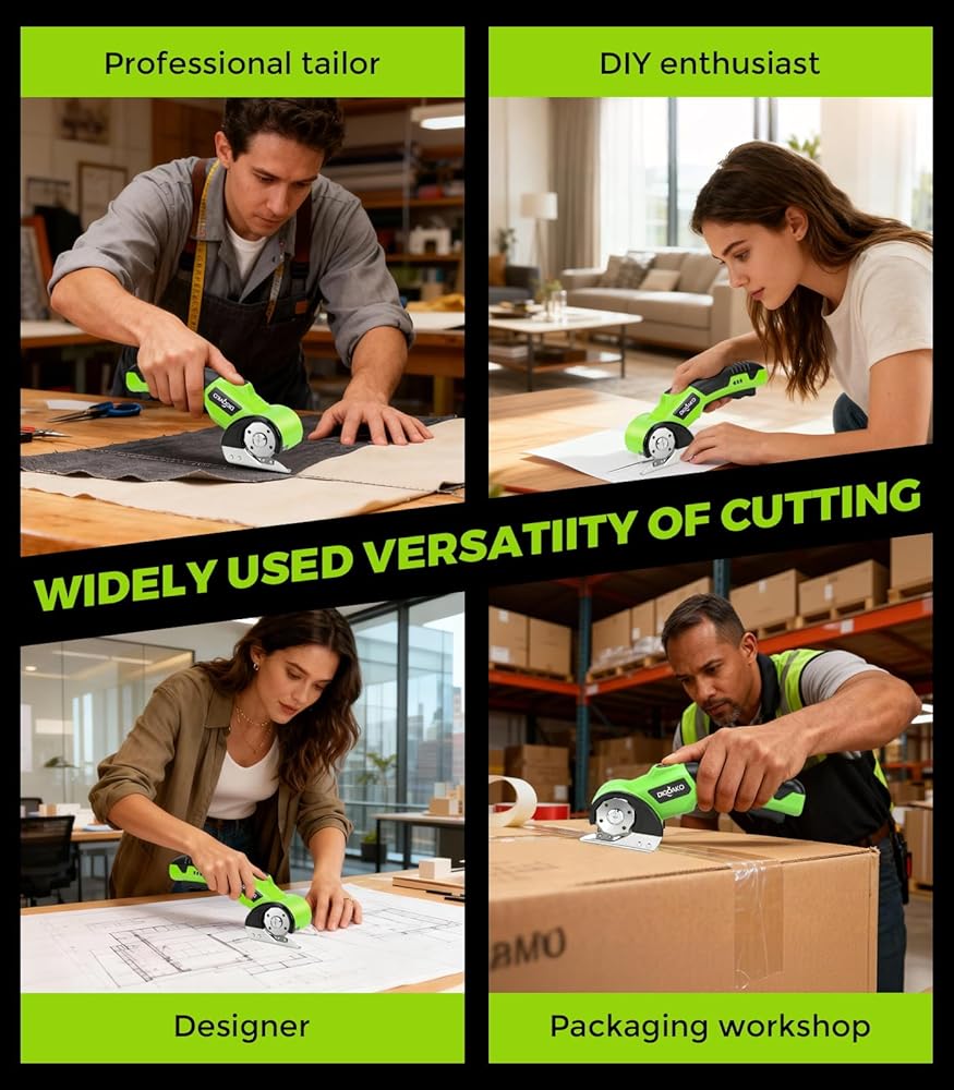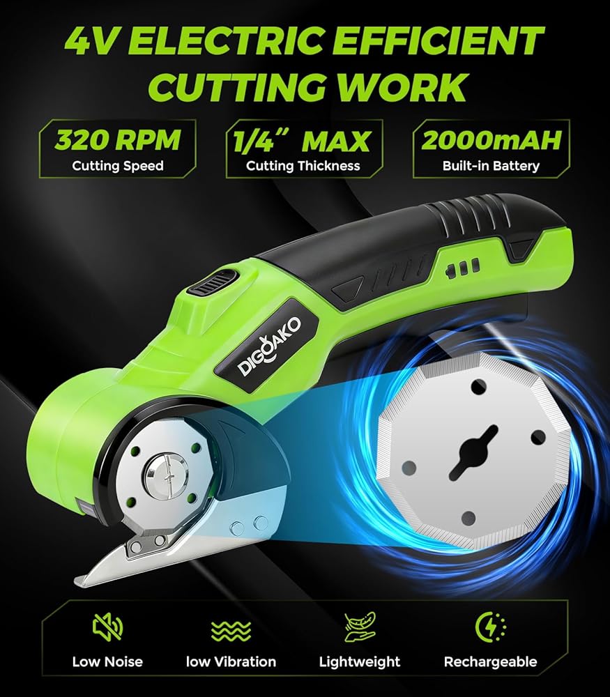 ⚡ مقص كهربائي لاسلكي قوي 4 فولت: محرك 4 فولت مطور بسرعة 320 دورة في الدقيقة يوفر قطعًا أسرع 10 مرات عبر الورق المقوى والنسيج والسجاد والجلد - بسمك يصل إلى 1/4 بوصة. تظل الشفرات ذاتية الشحذ حادة للحصول على دقة طويلة الأمد، مما يجعل كل قطعة نظيفة ومتسقة.