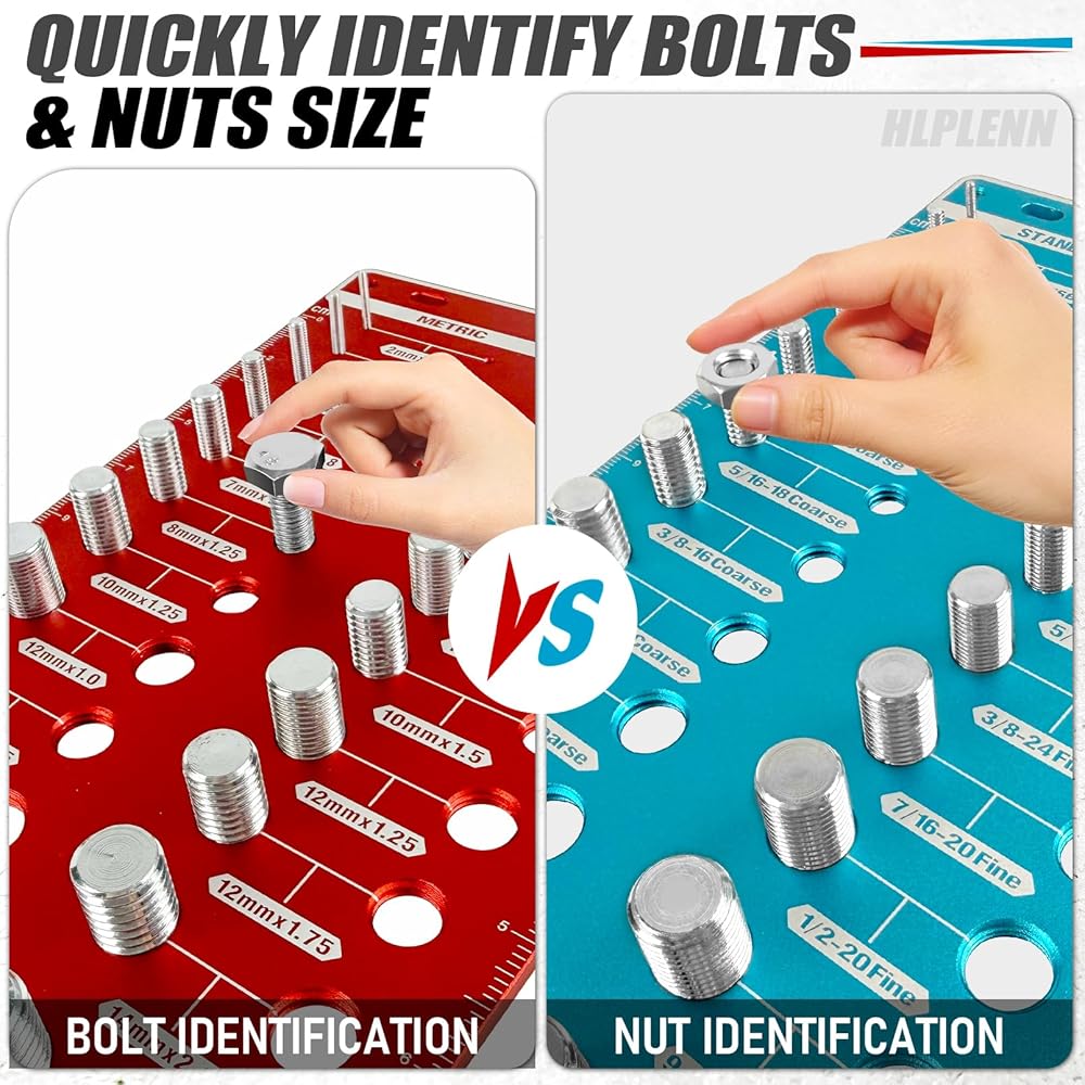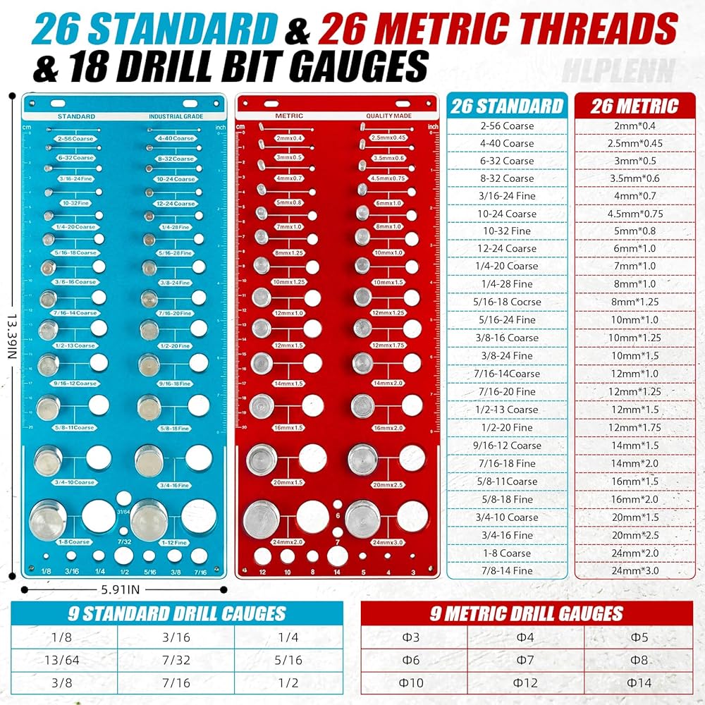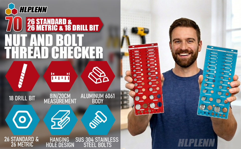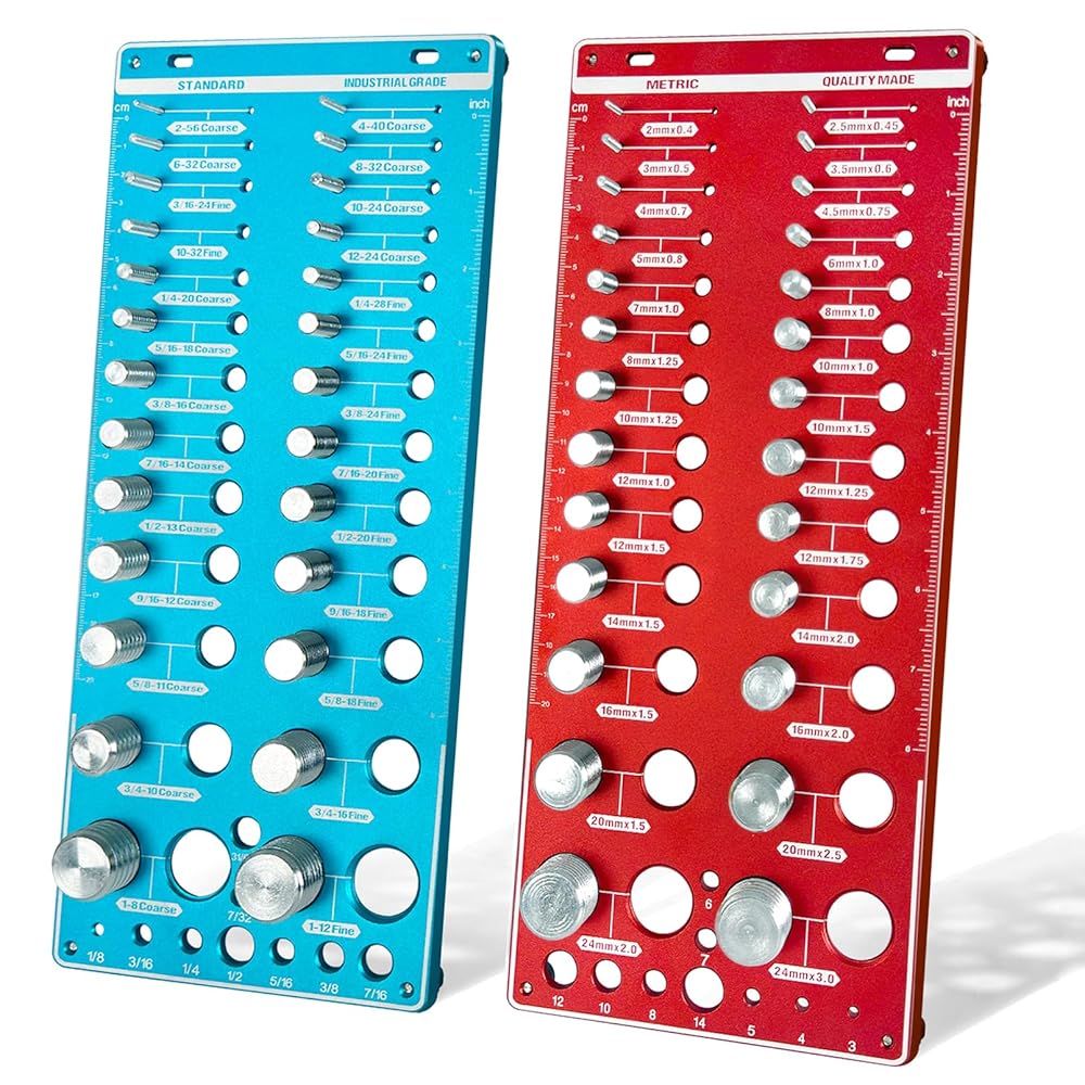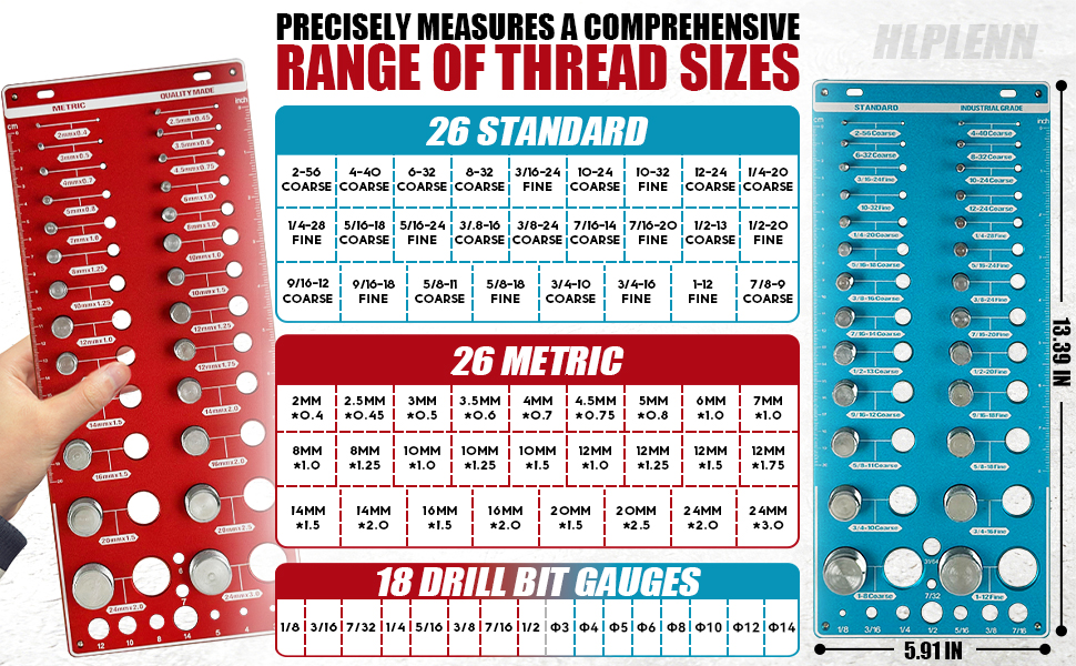 70 مقاسًا قياسيًا/متريًا: يحدد جهاز فحص خيط الصواميل والمسمار هذا 70 مقاسًا (26 متريًا، 26 قياسيًا، 18 مقياس حفر)، من M2x0.4 إلى M24x3.0 و#2-56 إلى 1-12 خشن لمهام المرآب أو ورشة العمل أو إصلاح المنزل