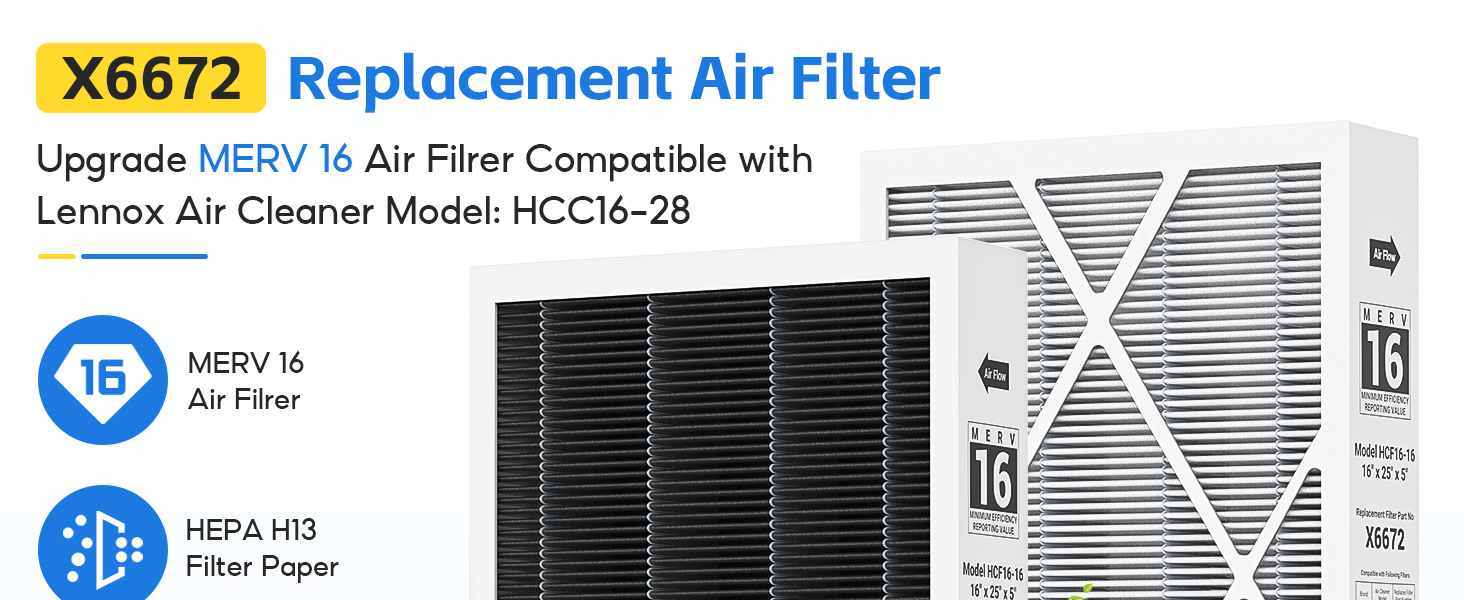【نماذج متوافقة مع فلتر X6672 16x25x5】: ①يتوافق فلتر الهواء X6672 16x25x5 MERV 16 تمامًا مع نظام Lennox HCC16-28 الصحي للمناخ الكربوني النظيف Merv 16 فرن التدفئة والتهوية وتكييف الهواء، الجزء القابل للتبديل # HCF16-16، HCF16-10؛ ②متوافق مع موديلات هانيويل: F25A1043، F25F1042، F35F1008، F100F1012، F150E1026، F200E1029، رقم الجزء FC35A1001، FC100A1029، FC200E1029؛ ③متوافق مع طراز الناقل: EZXCAB016، MACA016، MPKA016، FILCAB016، رقم القطعة EXPXXFIL0016، EXPXXUNV0016، EXPXXLMC0016، FILCCCAR0016؛ ④متوافق مع طراز Trion Air Bear Supreme 1400، 455602-119، رقم الجزء 255649-105.