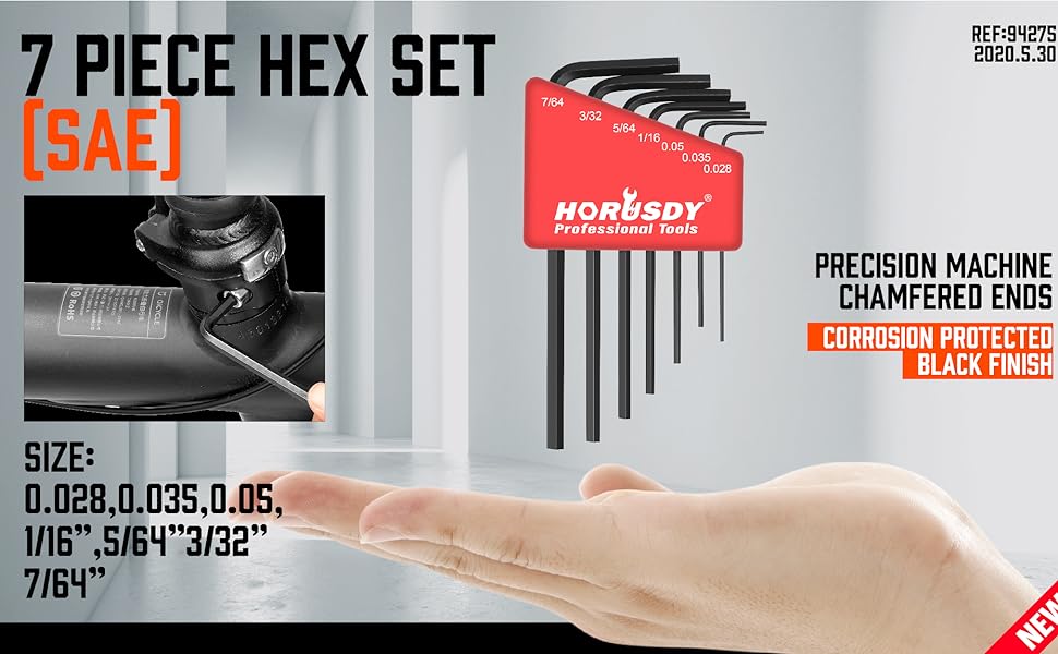 7 قطع مفتاح ألين سداسي الشكل SAE (الأحمر) الحجم: 0.028، 0.035، 0.05، 1/16 بوصة، 5/64 بوصة، 3/32 بوصة، 7/64 بوصة.