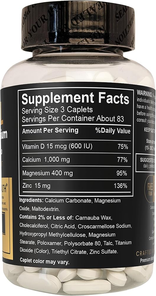 ✔ Long-Lasting Value Includes 250 coated caplets per bottle, providing up to an 83-day supply when taken as directed (3 caplets per day). Suplemento Diario de Calcio Magnesio y Zinc con Vitamina D3.
