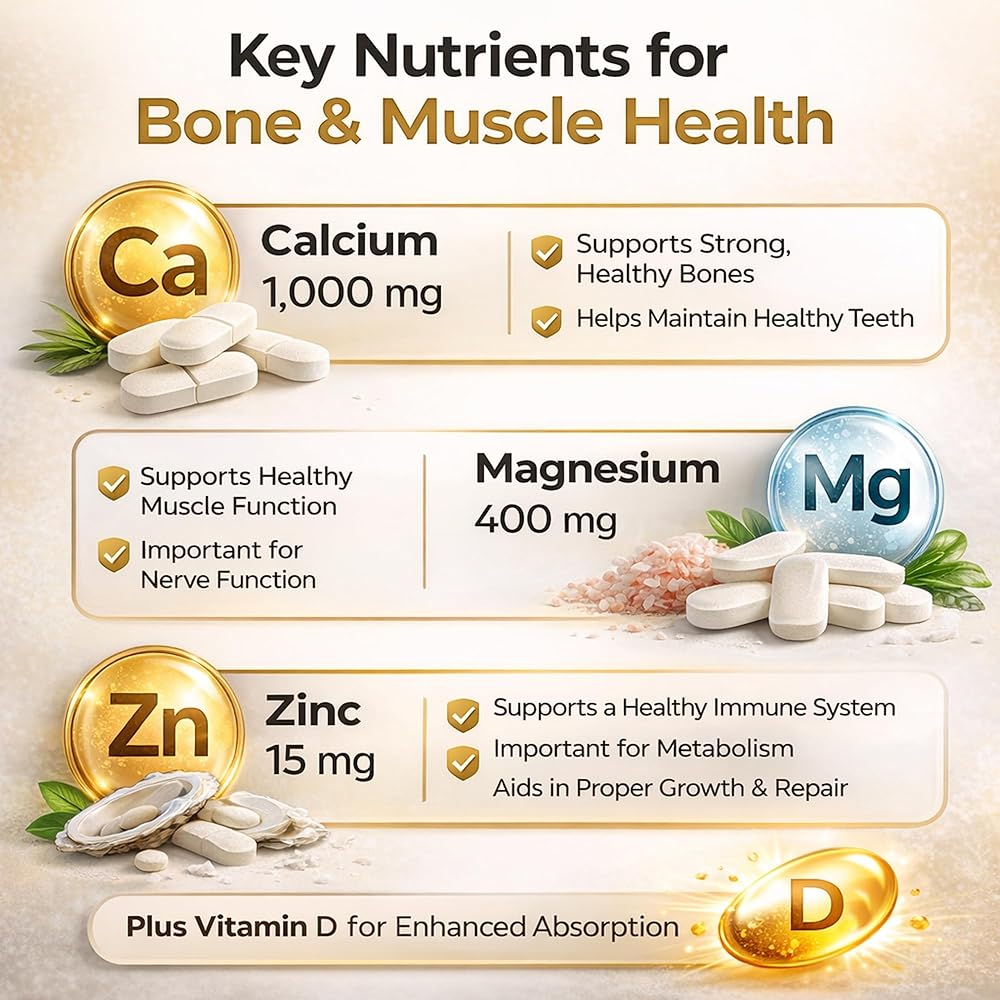 ✔ Bone & Muscle Support Supports strong bones, muscles, and overall mobility with a balanced blend of calcium magnesium supplement, zinc, and vitamin D for daily nutritional support.