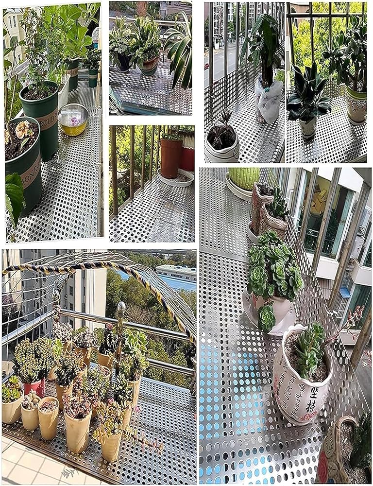 This stainless steel perforated safety net is an ideal solution for balcony and stair protection, designed to enhance safety and aesthetics in your home. Made from high-quality 304 stainless steel, this durable net is resistant to corrosion, ensuring long-lasting performance in any environment. The elegant silver finish and unique round hole design, featuring a 10mm aperture and 5mm hole spacing, not only provide security but also add a modern touch to your living space. With a thickness of 0.8mm, this sturdy yet lightweight safety net is easy to install. It comes with plastic cable ties that securely attach the net to various surfaces, including balcony railings and staircases, providing peace of mind for families with children or pets. Additionally, the anti-theft window backing plate allows you to place potted plants, succulents, or shoes safely, effectively maximizing your available space. This customizable safety net is perfect for a wide range of applications, including balconies, railings, stairs, gardens, windows, courtyards, and terraces. It's not just a protective measure; it's a practical addition to your home that enhances both safety and functionality. The package includes one protective net along with essential accessories like cable ties and gloves for a hassle-free installation experience. Please note that only the stainless steel mesh is included in the purchase; other items shown are for display purposes only. Invest in your home safety with this reliable and stylish stainless steel safety net.