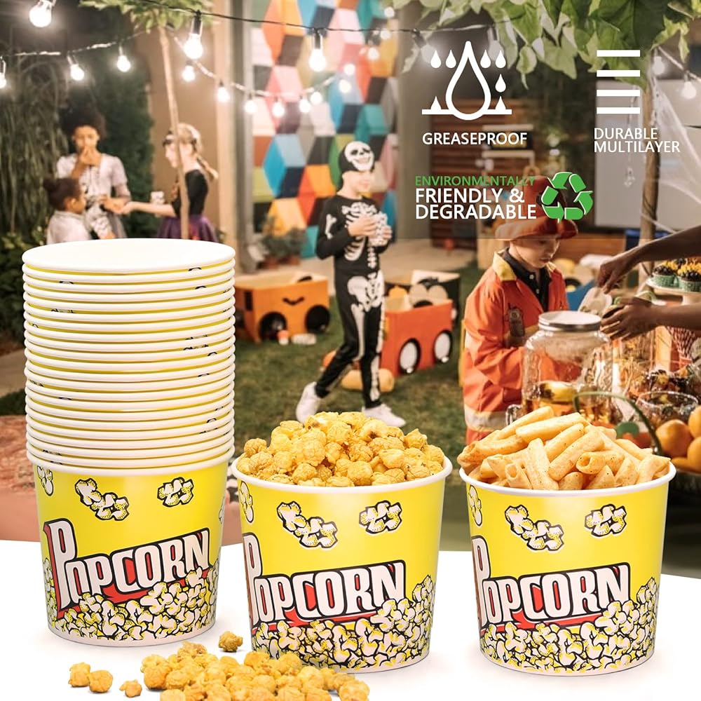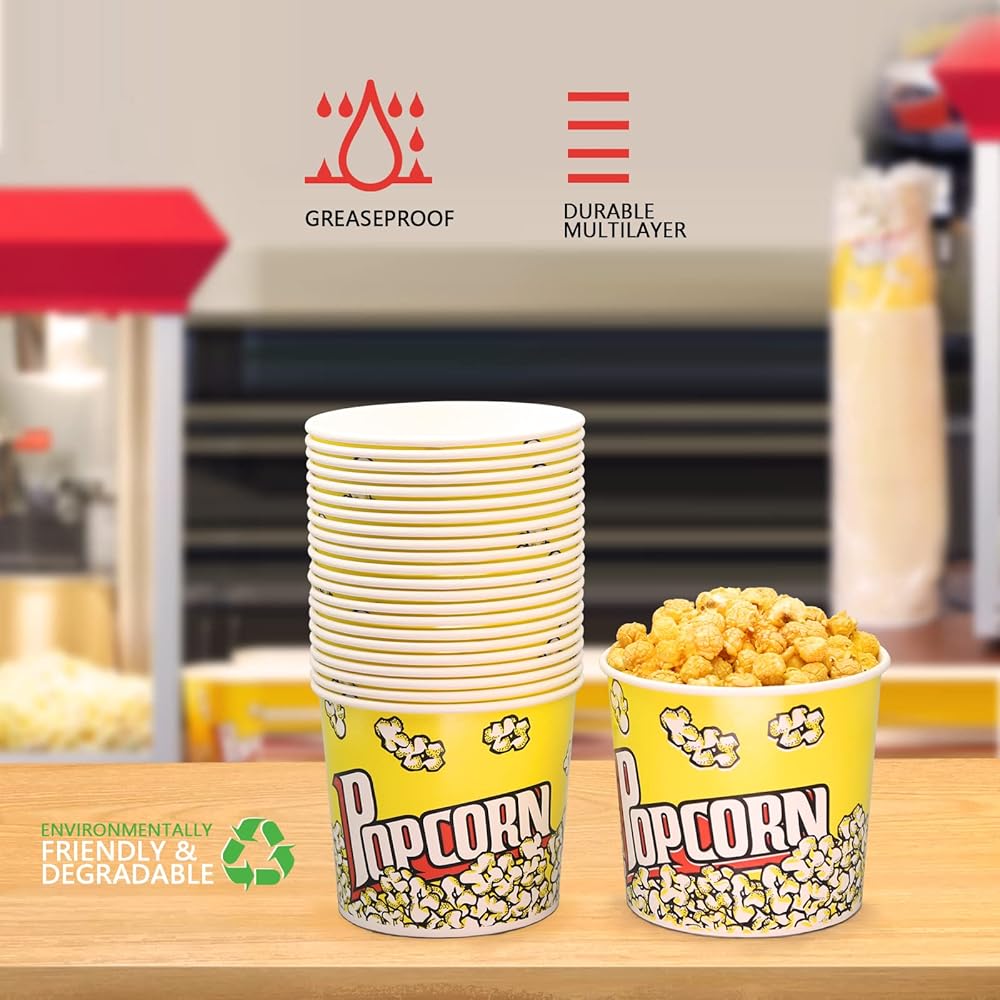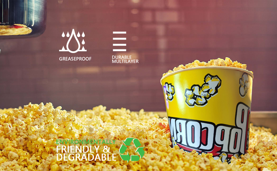 DISPOSABLE GREASE PROOF CONTAINERS: Made of premium quality paperboard material, our durable paper popcorn cups are grease-resistant. You'll never have to worry about butter or grease leaking through the bucket and getting onto your clothes