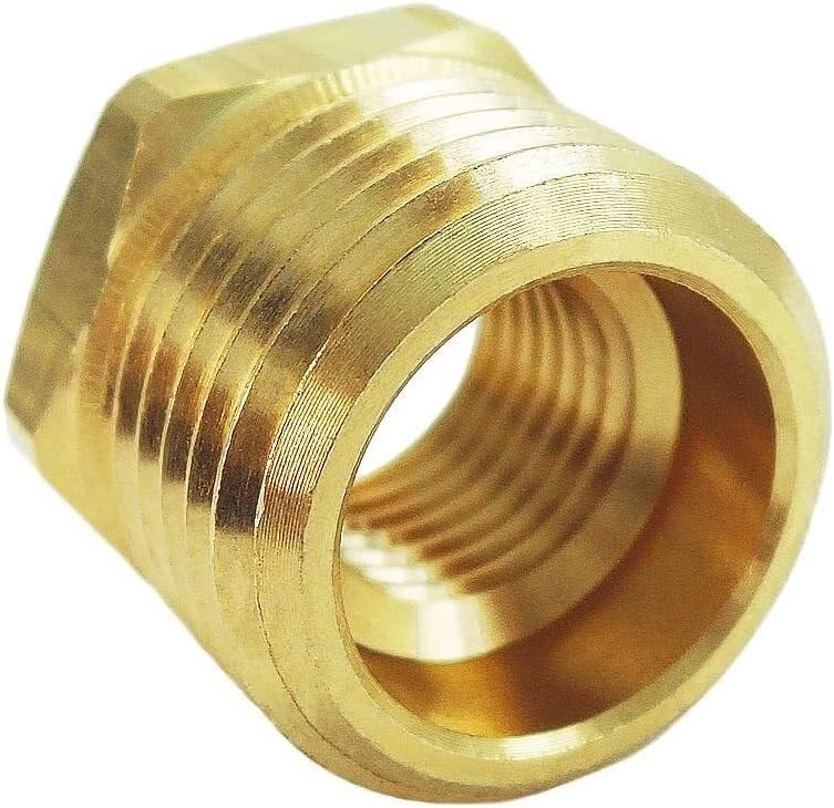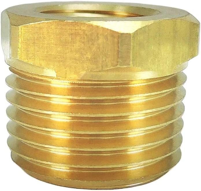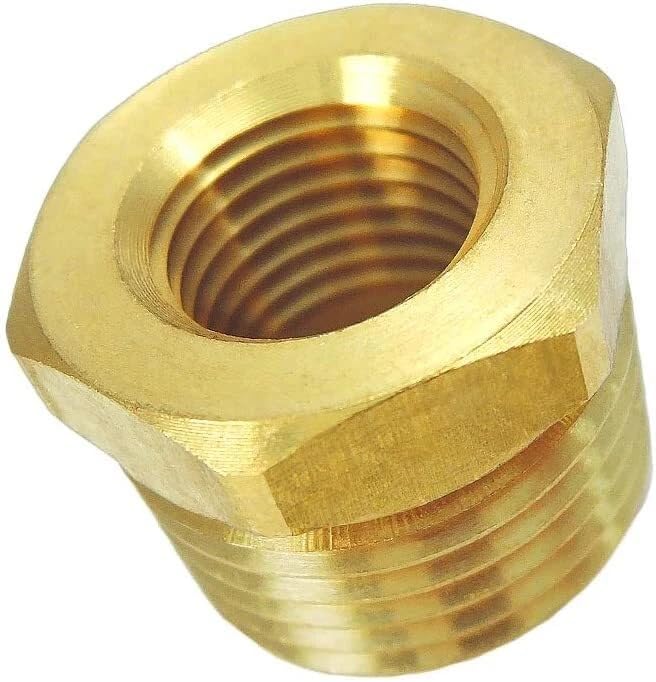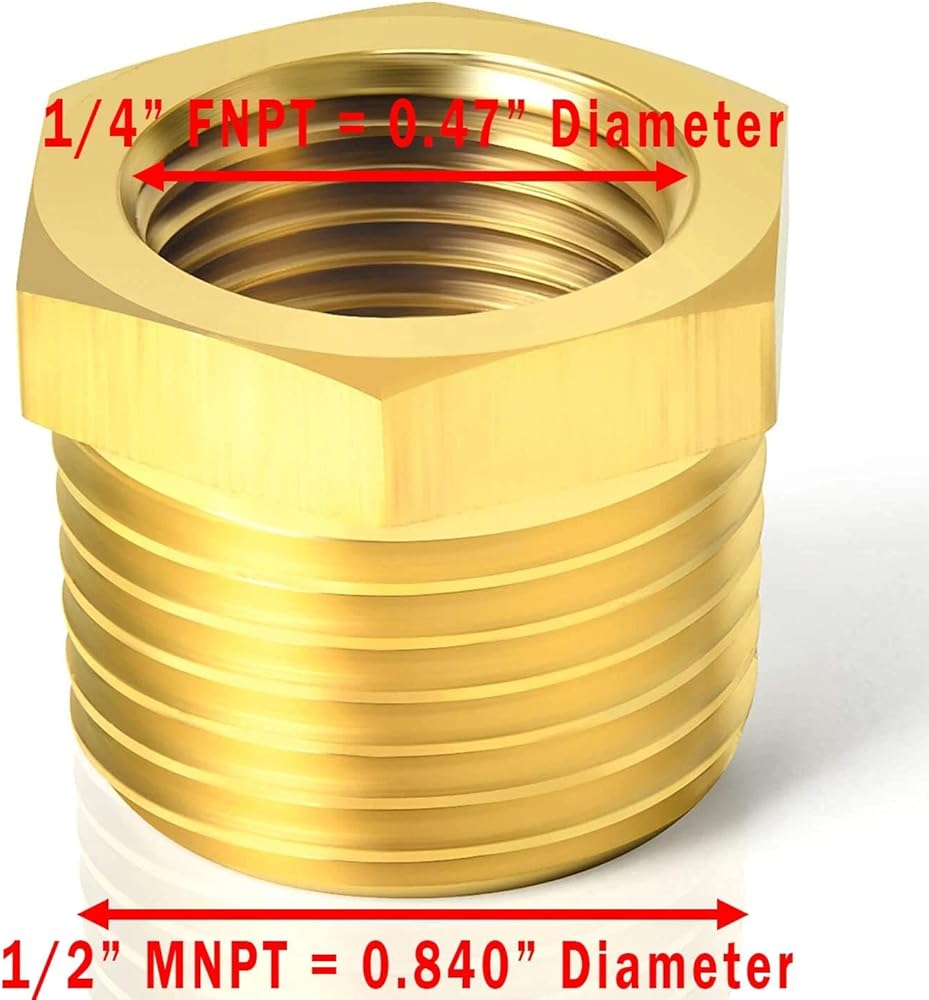 Hex bushing for connecting two pipes with different diameters Male NPT threads on one end and female NPT threads on the other for connecting pipes with different ends Brass for corrosion resistance, ductility at high temperatures, and low magnetic permeability Use in plumbing connections, compressed air, hydraulic, gas and other applications, hex nut for easy tightening and loosening 1/2" MNPT Male is measure Nominal Outside Diameter Pipe OD(inches) 0.84 inches. 1/4" FNPT Female is measure Nominal Outside Diameter Pipe OD(inches) 0.47 inches.